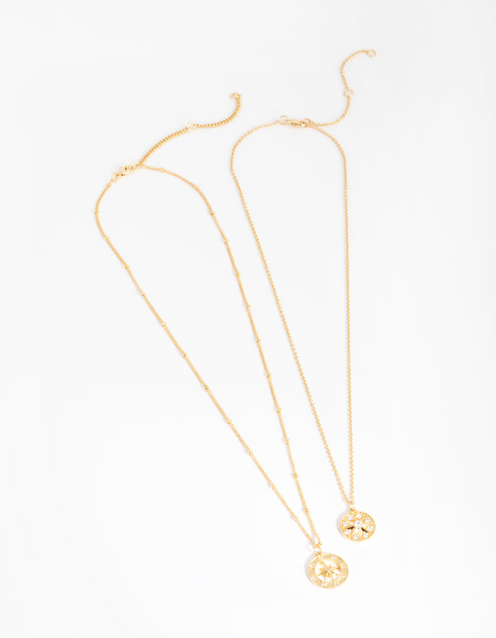Celestial, talisman and tarot-inspired pieces: a collection of vintage-inspired jewellery designed to be kept and treasured. This lovely necklace set is plated with genuine 18ct gold for authentic lustre and shine. It features two necklaces with a compass-style design. Each are embellished with cubic zirconia, and boast a star at their centre. Commanding yet beautiful, wear these ethereal pieces as your personal talisman.