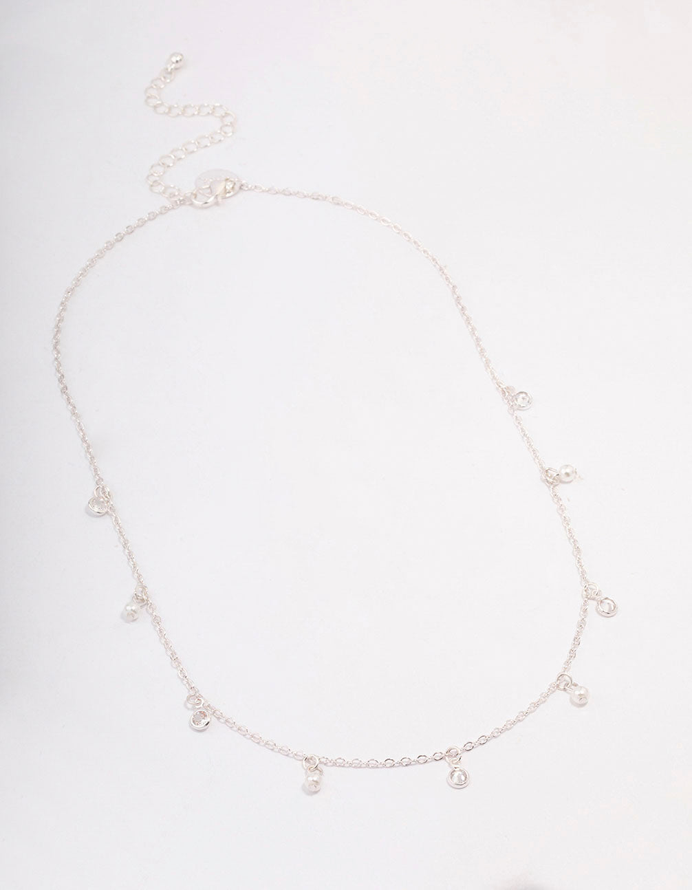 Silver Diamante & Pearl Drop Station Necklace Silver Diamante & Pearl Drop Station Necklace