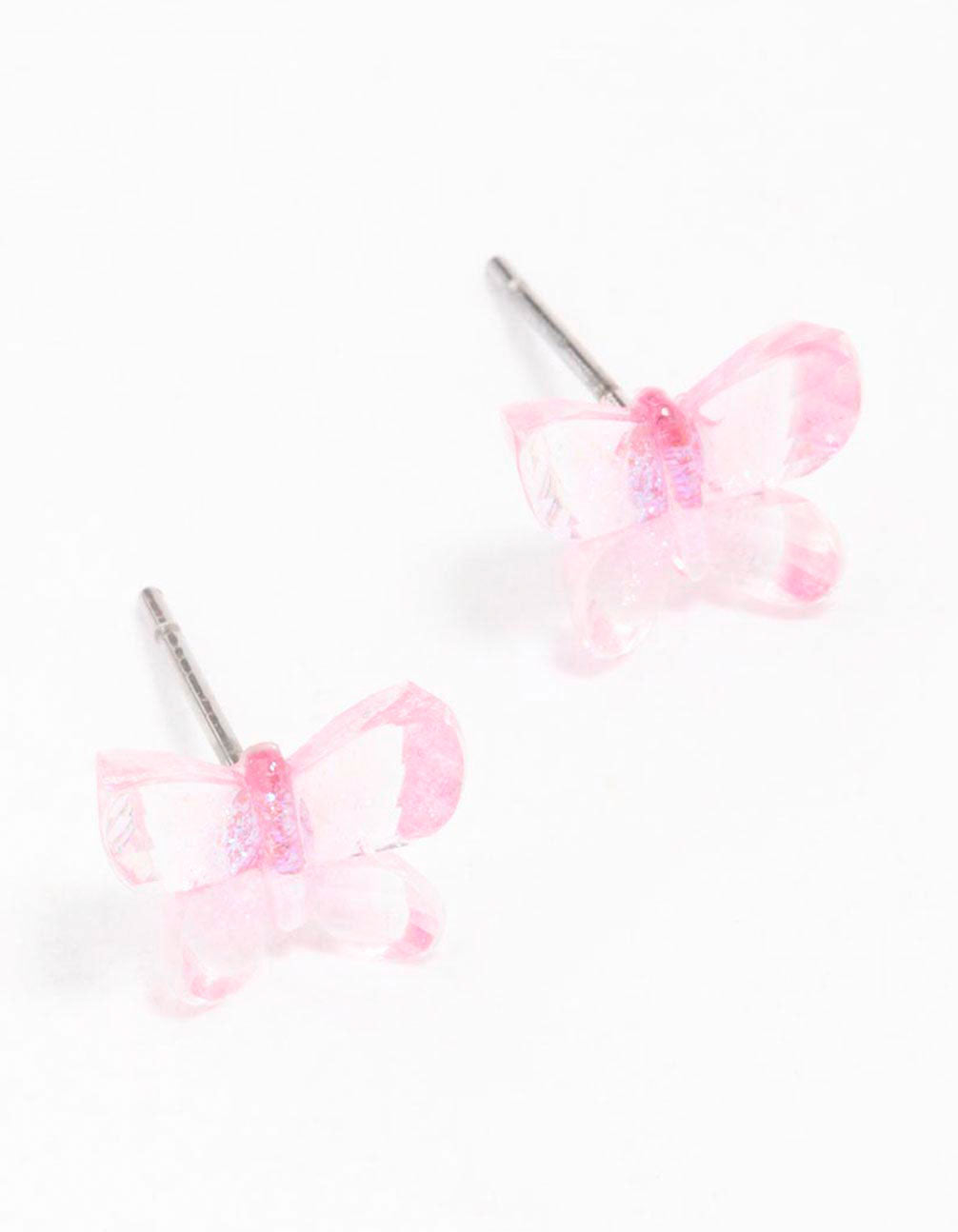 Add a pop of colour to your look with these dainty, pink butterfly studs. These stud earrings feature a mini butterfly design, made from a glittery acrylic.