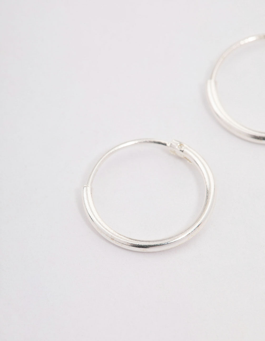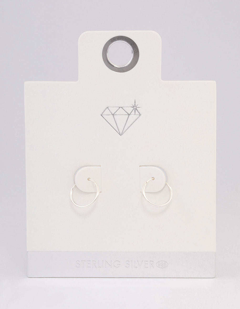 - This set of staple sterling silver hoop earrings features a dainty and fine profile, perfect for styling in your everyday stack.