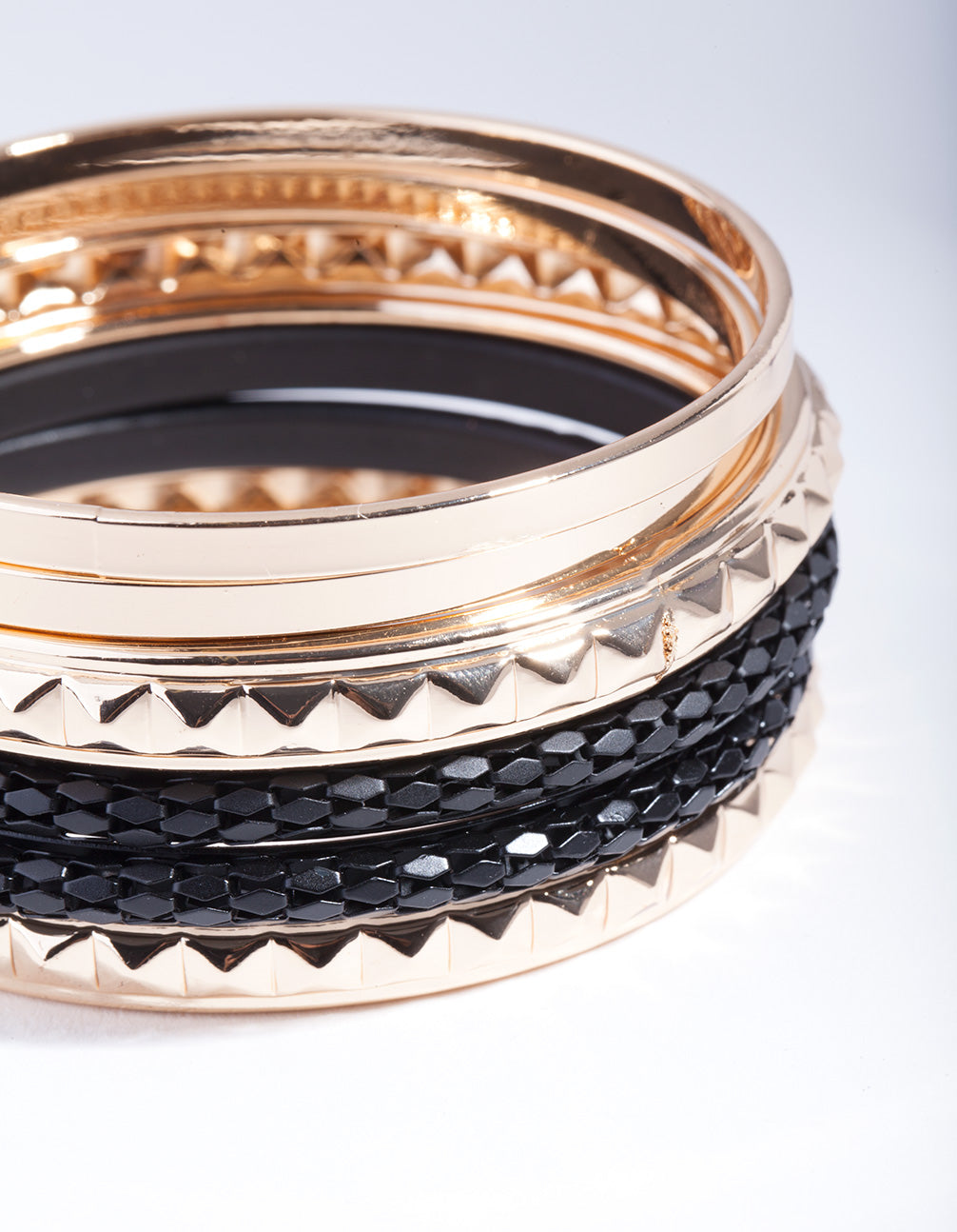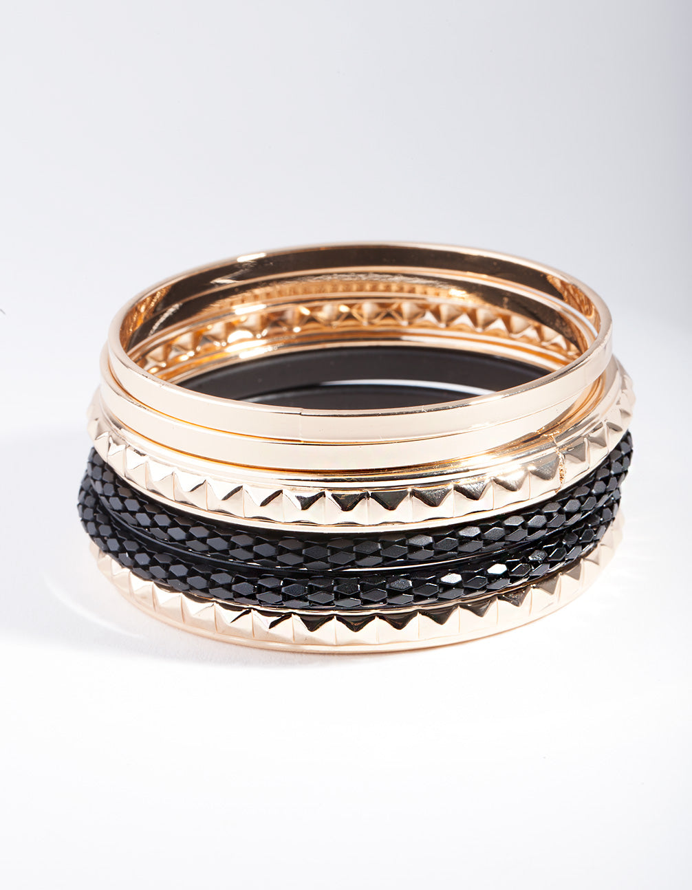 Layer up with a bangle pack. This style features a black and gold-toned textured design with 6 different styles.
