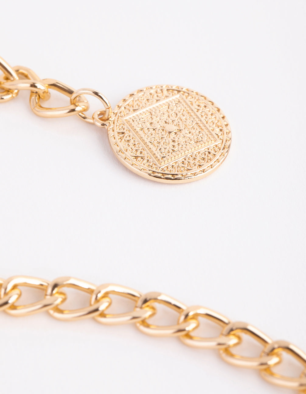 It doesn't get much more chic than this. This gold-toned belt is comprised of stylish chains that are adorned with two detailed coin pendants. Style with your favourite evening dress for a sophisticated finish, or wear it to elevate a casual ensemble.