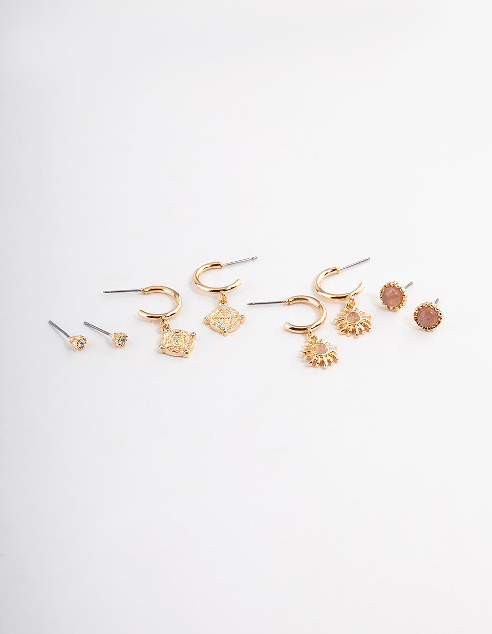- Style this multi-pack of four celestial earrings, designed with sun and star details and intricate textures.