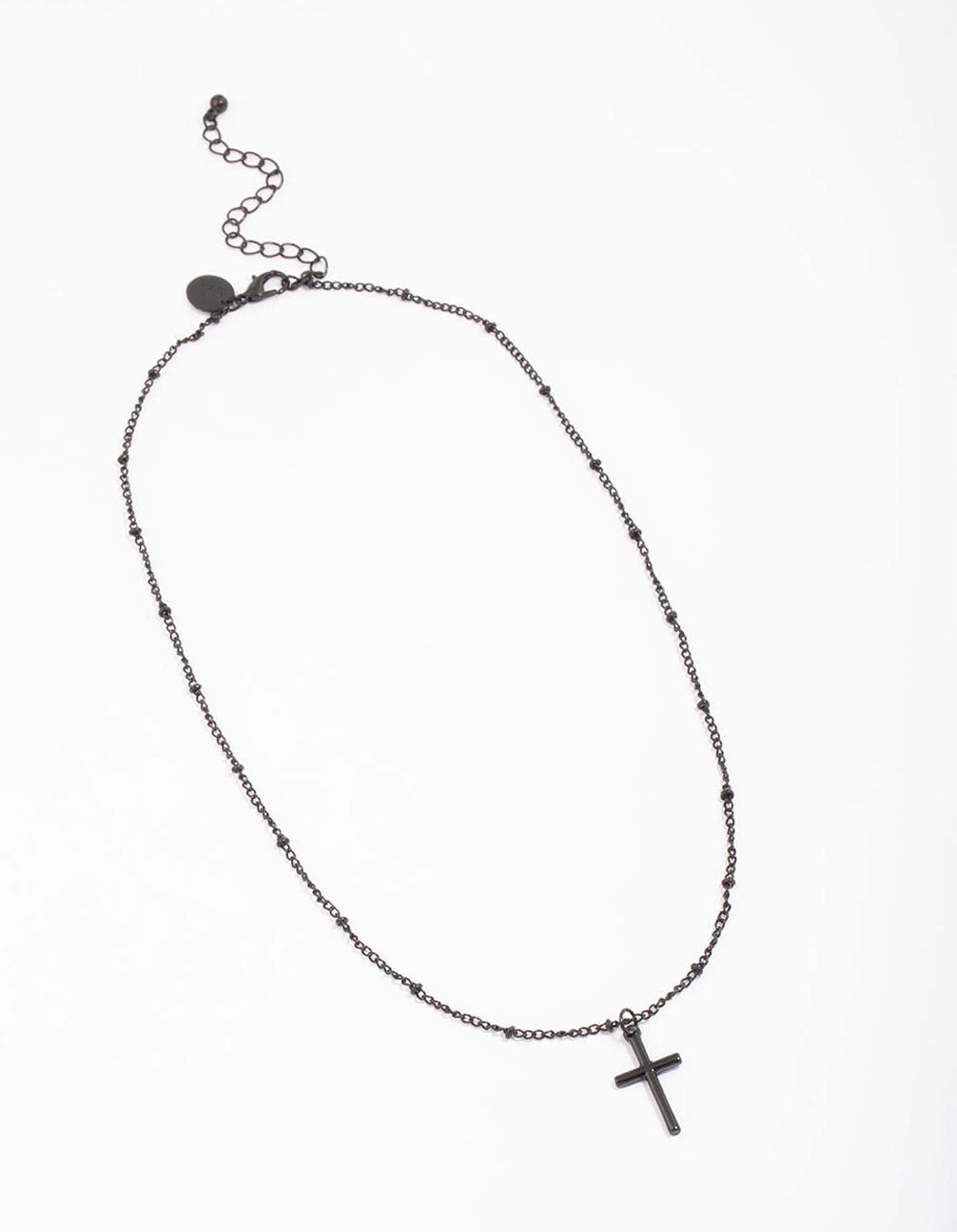 Add drama to your look with this classic black pendant necklace. This chain features a matte black setting, adorned with a cross pendant for an edgy finish to your look.
