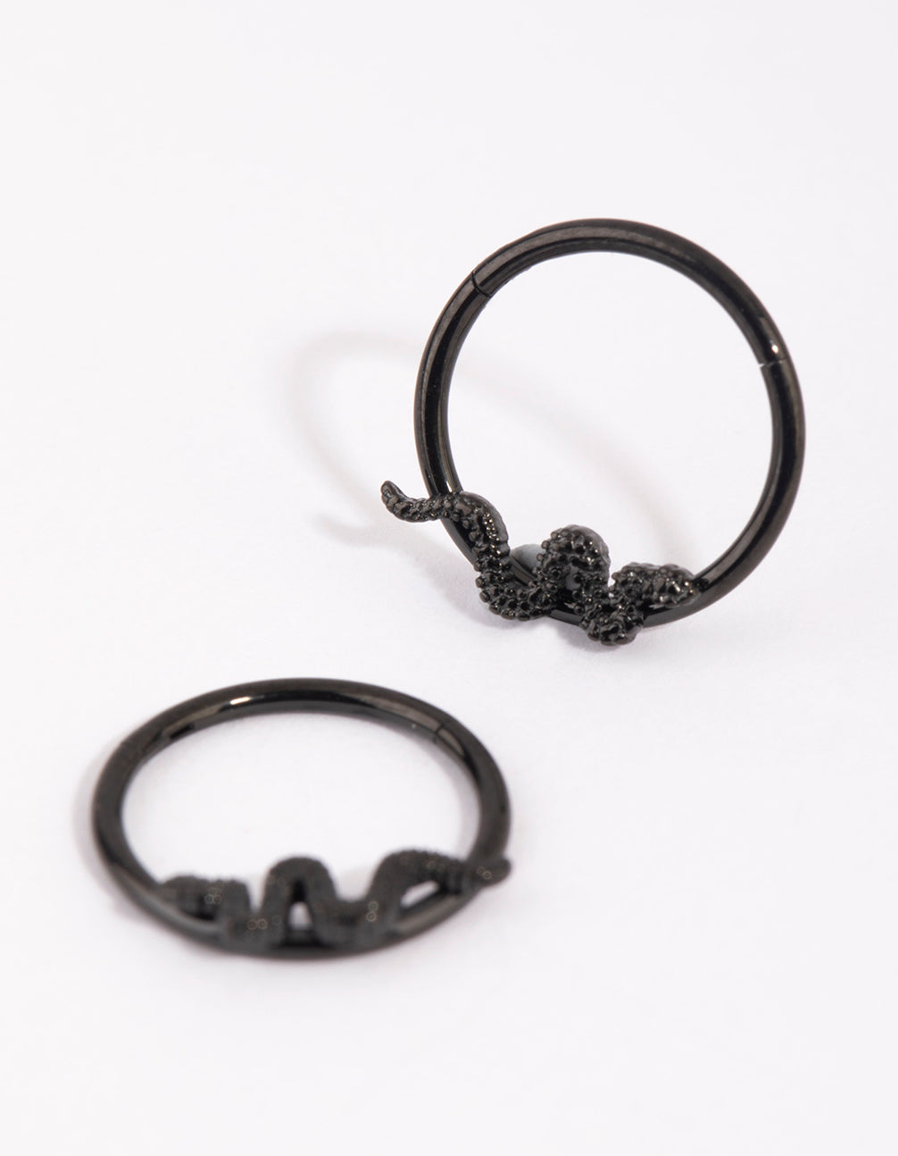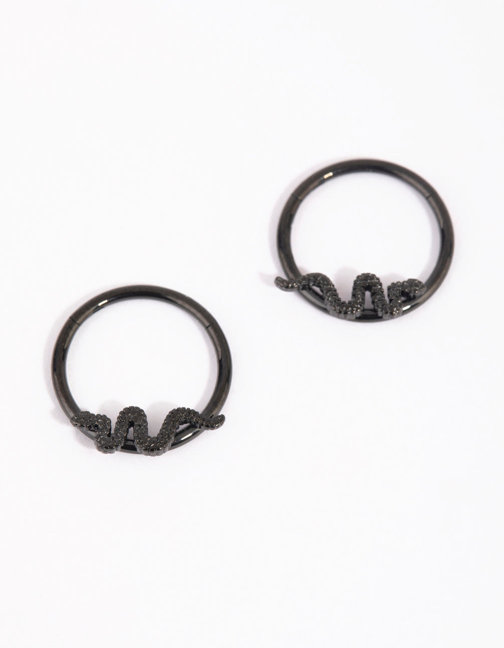 Designed with sensitive skin in mind, the Lovisa Sensitive Jewellery Collection utilises premium materials that reduce the risk of irritation. These matte black sleepers are made with surgical steel so they're gentle on skin. They feature a snake design.