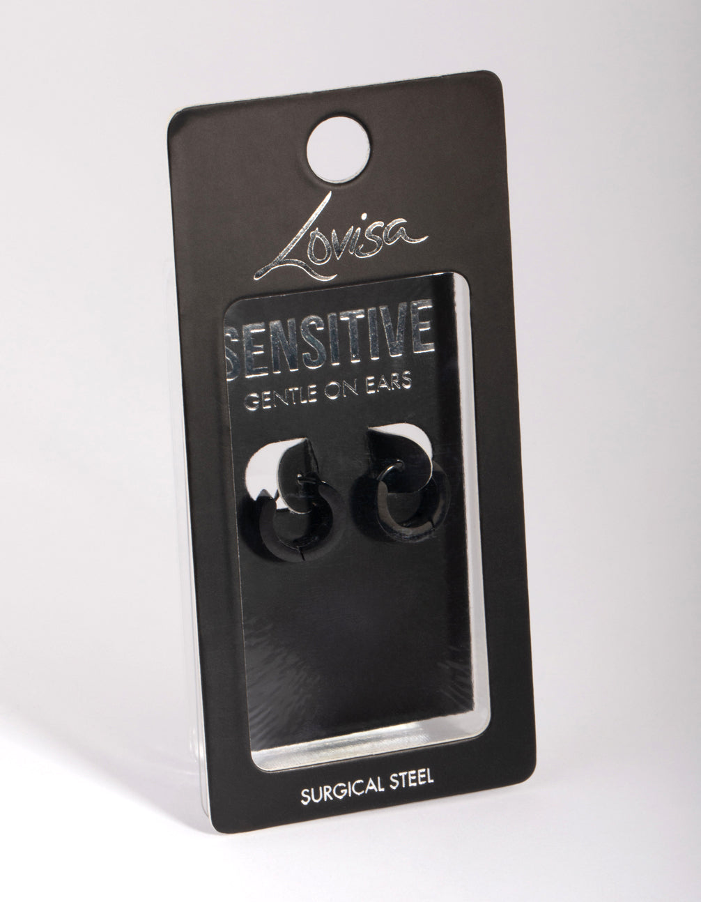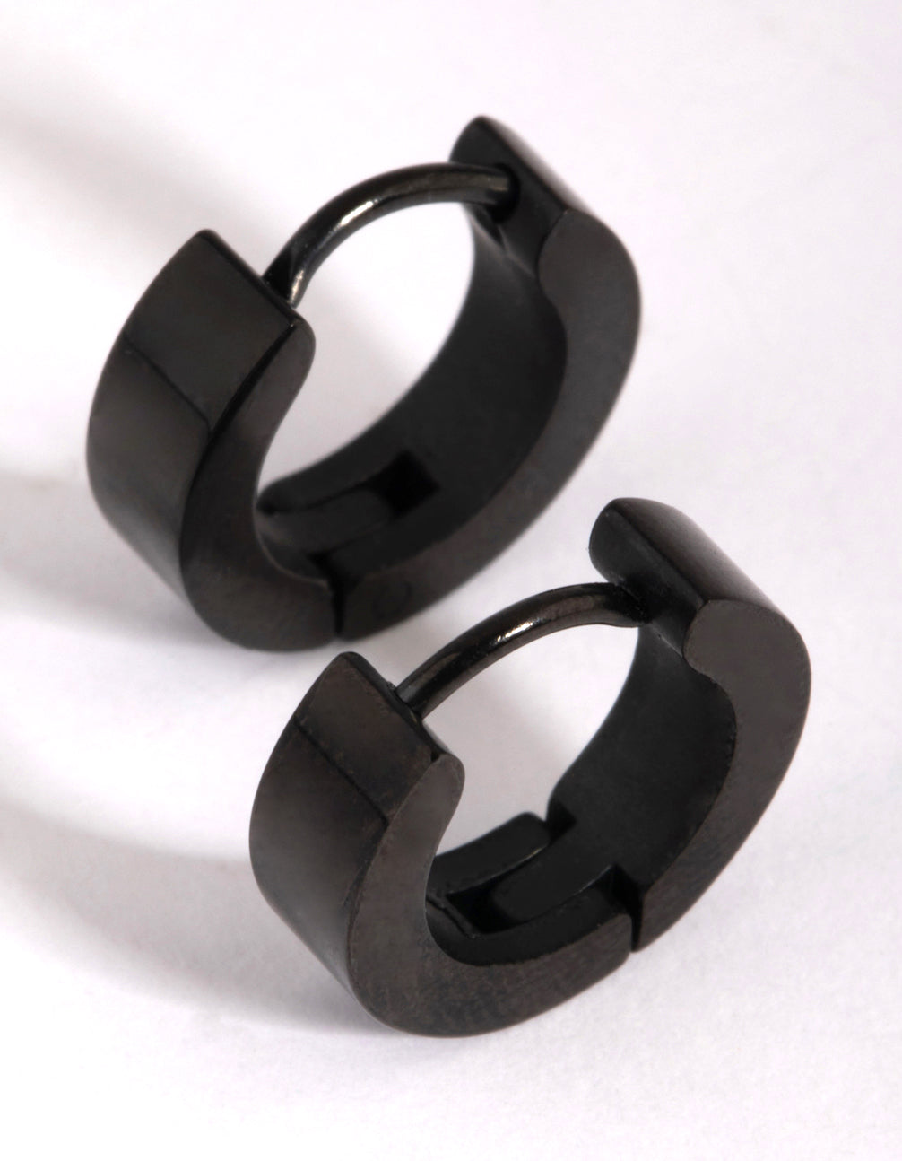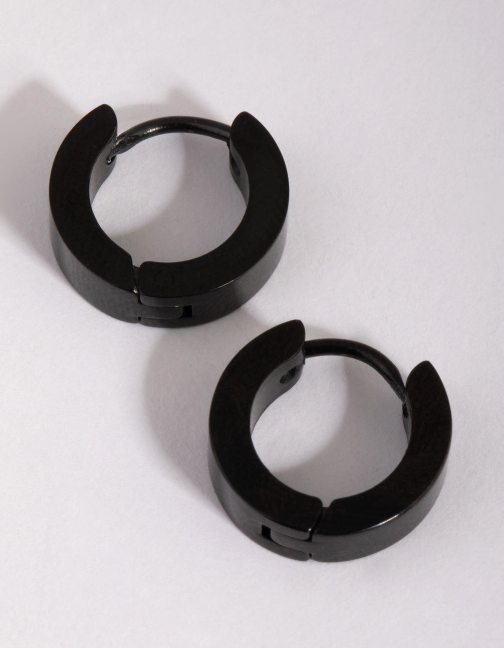 Embrace edge with these black huggie earrings. These edgy earrings are crafted using black coated surgical steel for hypoallergenic wear and bold wider huggie design.