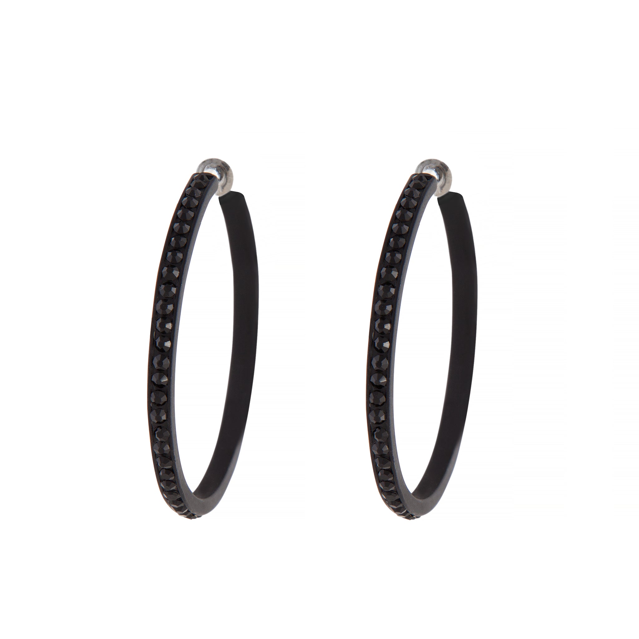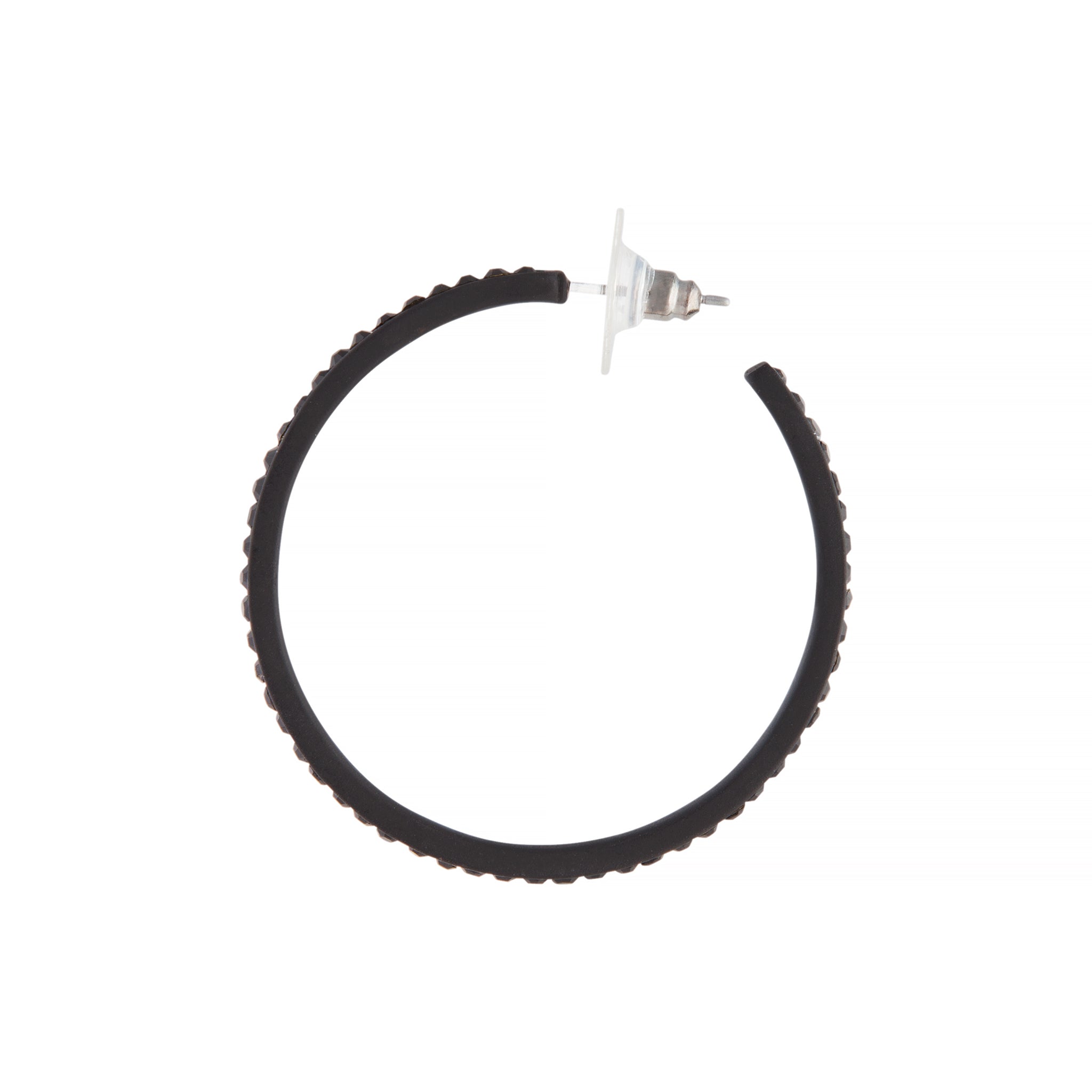 Statement earrings are the easiest way to switch up your wardrobe! Conversation-starting styles mean that a new pair of earrings replace the need for a new dress. This pair of black hoop earrings feature a flat edge and jewel encrusted design for extra glamour. Style with black rings, sleek hair and a bold lip for a dramatic look.
