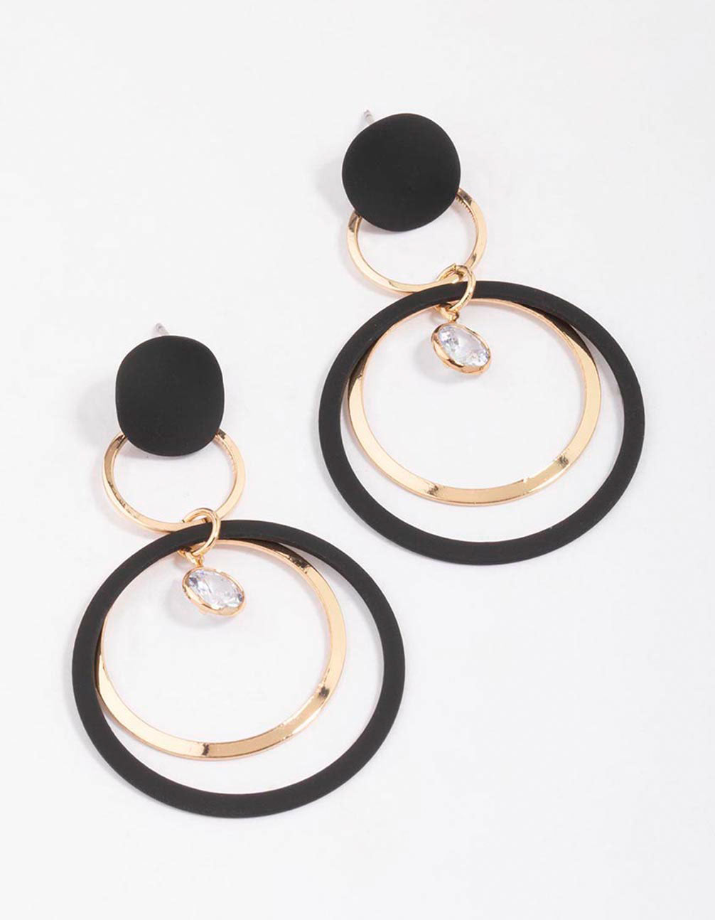 These unique drop earrings feature a black and gold setting, designed with overlapping discs for a modern feel.