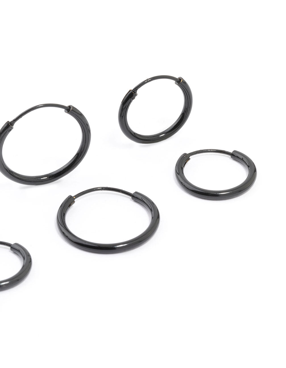 Give your looks a boost with these versatile black mixed fine hoop earrings. This set of 4 features small, medium and large hoop earrings in a black finish. Wear one pair or mix and match for endless styling options.