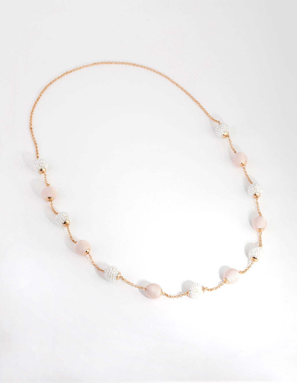 Channel Parisian chic with this lovely necklace. It features a long chain, with white and blush beads arranged around the chain in a station pattern. Drape it on over a white dress for a casual, yet chic, finishing touch.