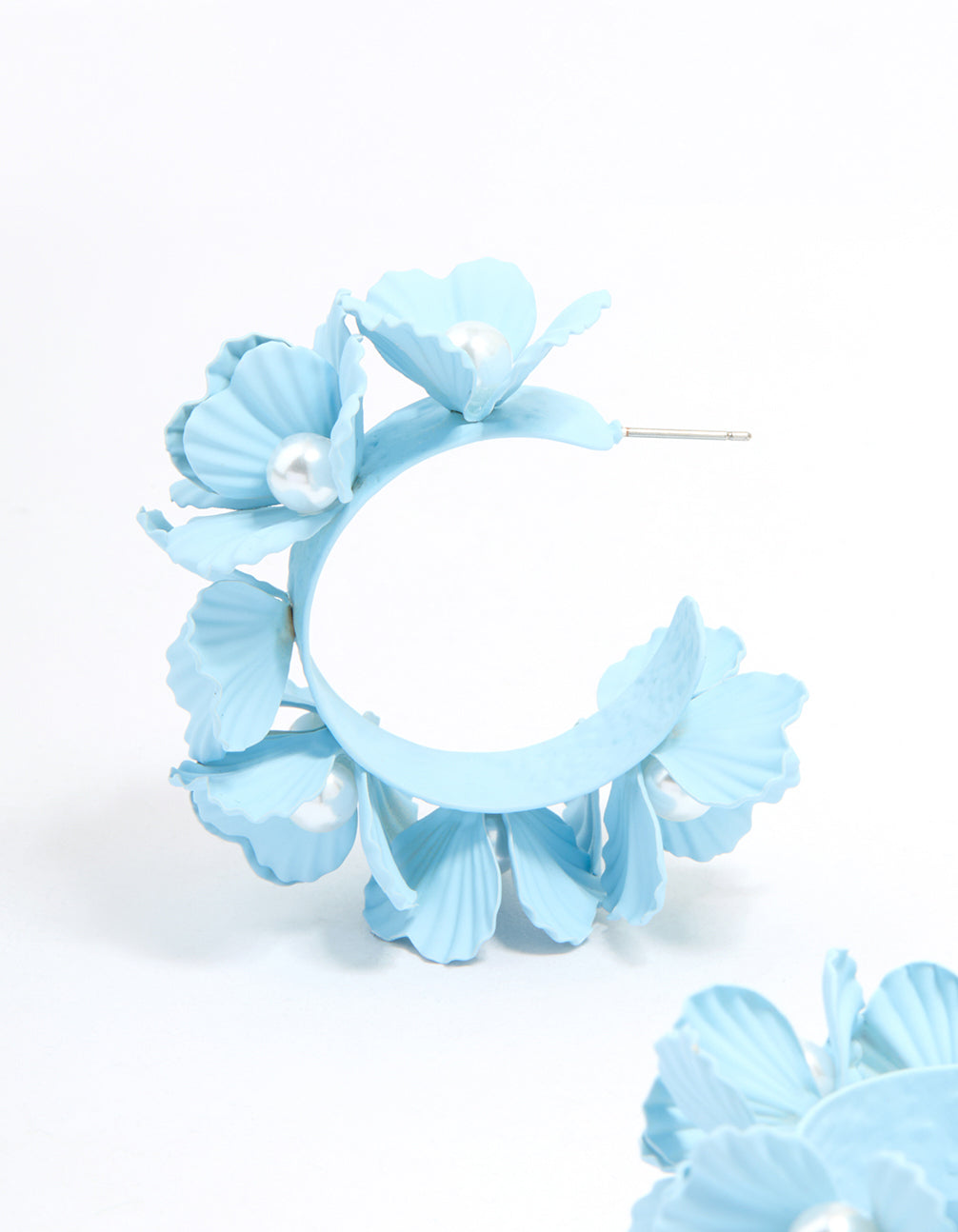 Blue Coated Metal Pearl Center Flower Hoop Earrings