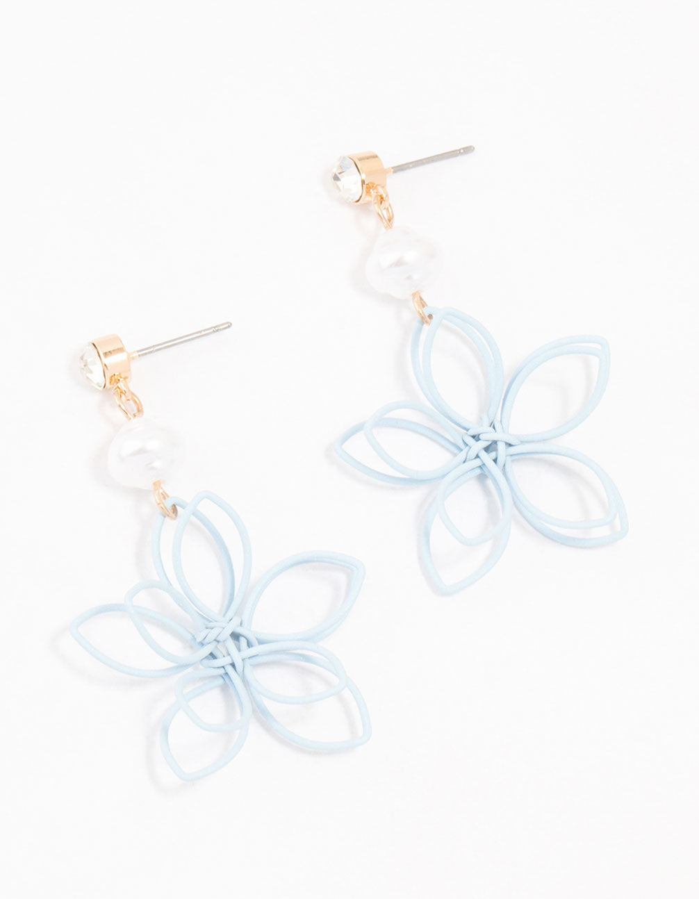 Blue Coated Metal Wire Flower Pearl Drop Earrings