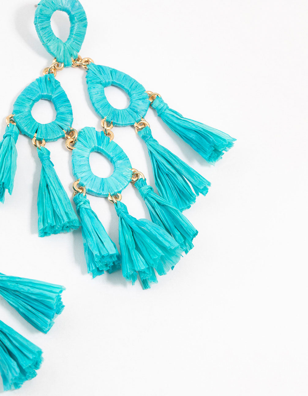 Sway with the ocean breeze in these dreamy Blue Raffia Tassel Drop Earrings. The light blue tassel look creates a soft, airy look that dances with your every move, while the tasseled silhouette adds a playful, carefree vibe, perfect for the beach.