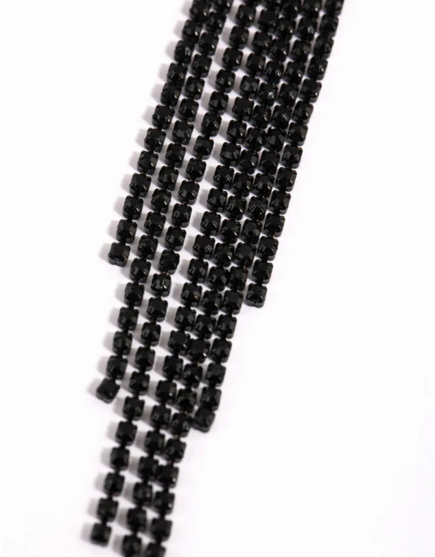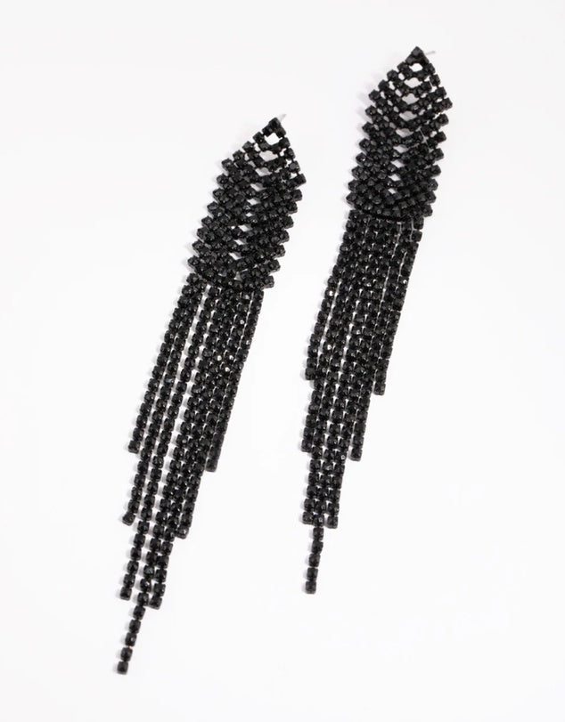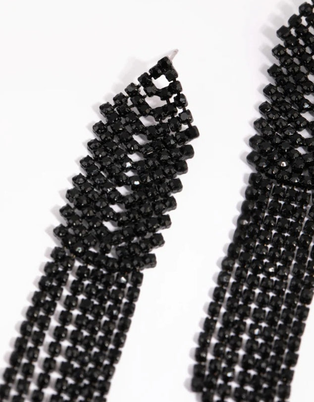Be dark, be dramatic - black on black jewellery is here to make an impression! These bold earrings feature a glittering diamante design in a jet-black tone. They feature an impressive 13.5cm drop. Wear them with dark hues for a classic look, or embrace contrast and pair them with vivid colours.