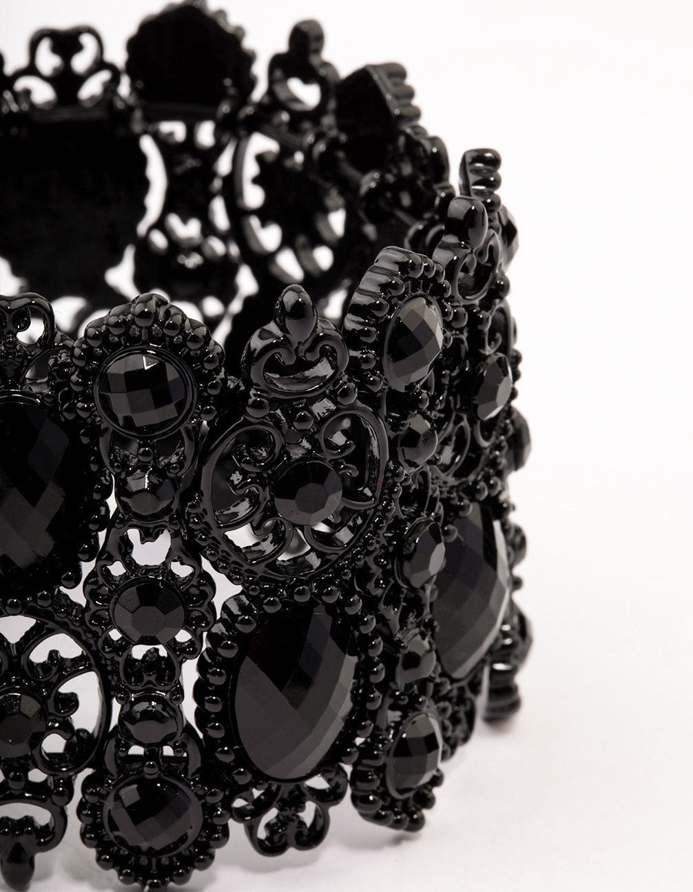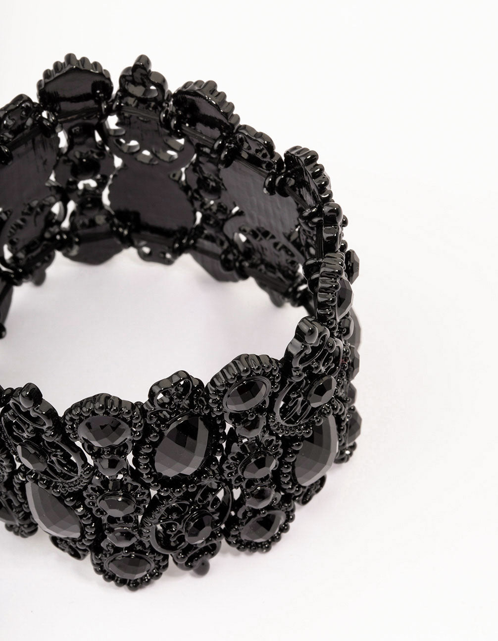 This stretchy bracelet is crafted from black lace and features a unique pattern adorned with black diamantes for a drama-filled look.