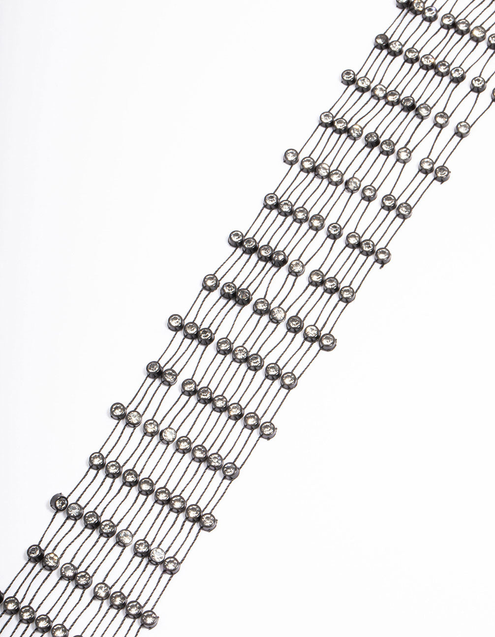 - This Black Mesh Stretch Diamante Scarf Necklace features a fabric material, embellished with black diamantes that can be fashioned into a scarf for a touch of drama.