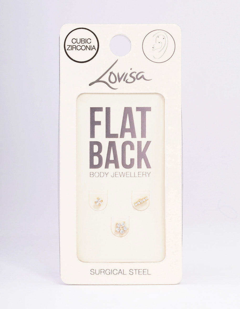 - This gold plated flat back pack contains three embellished piercings, featuring cubic zirconia crystals for a luxe finish. Style these flat backs as helix, cartilage or tragus piercings.