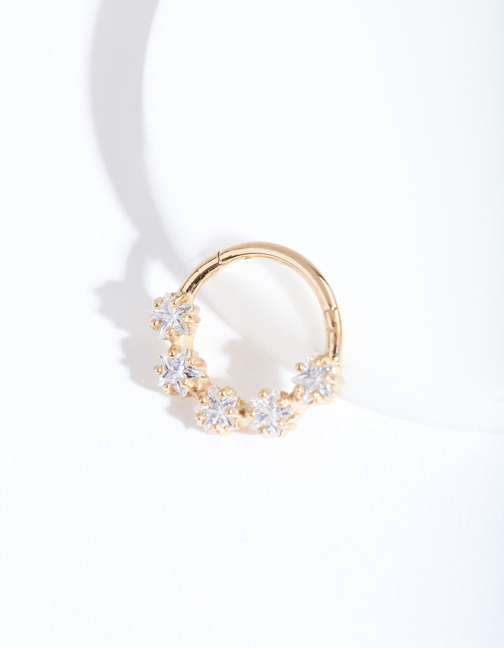Our body jewellery is made with surgical steel, making it ideal for daily wear. This stunning clicker earring features a 5 star cubic zirconia adorned design in a gold-tone. Cartilage earrings look great as helix, conch and tragus piercings. Check out our cubic zirconia range for accessories to match!