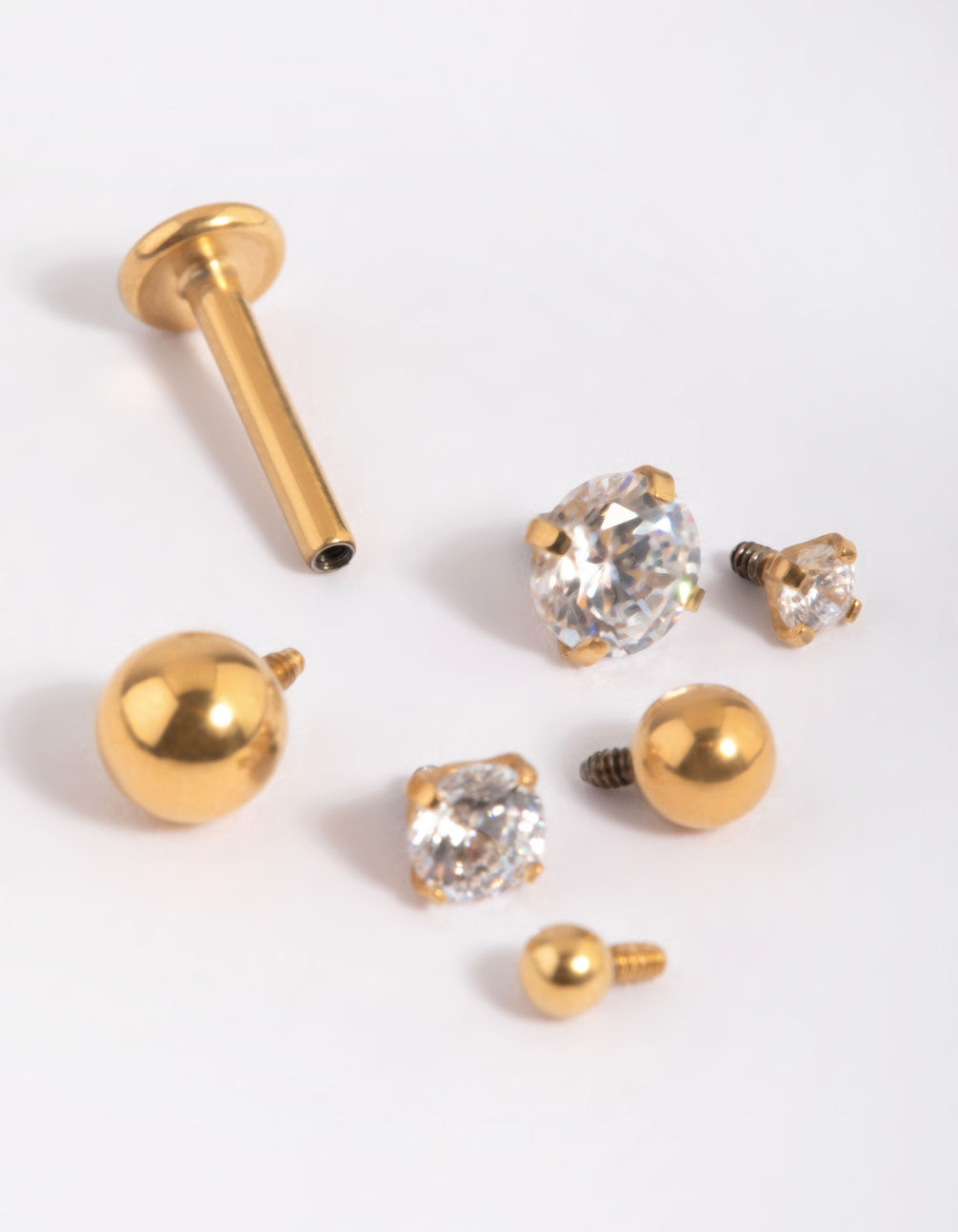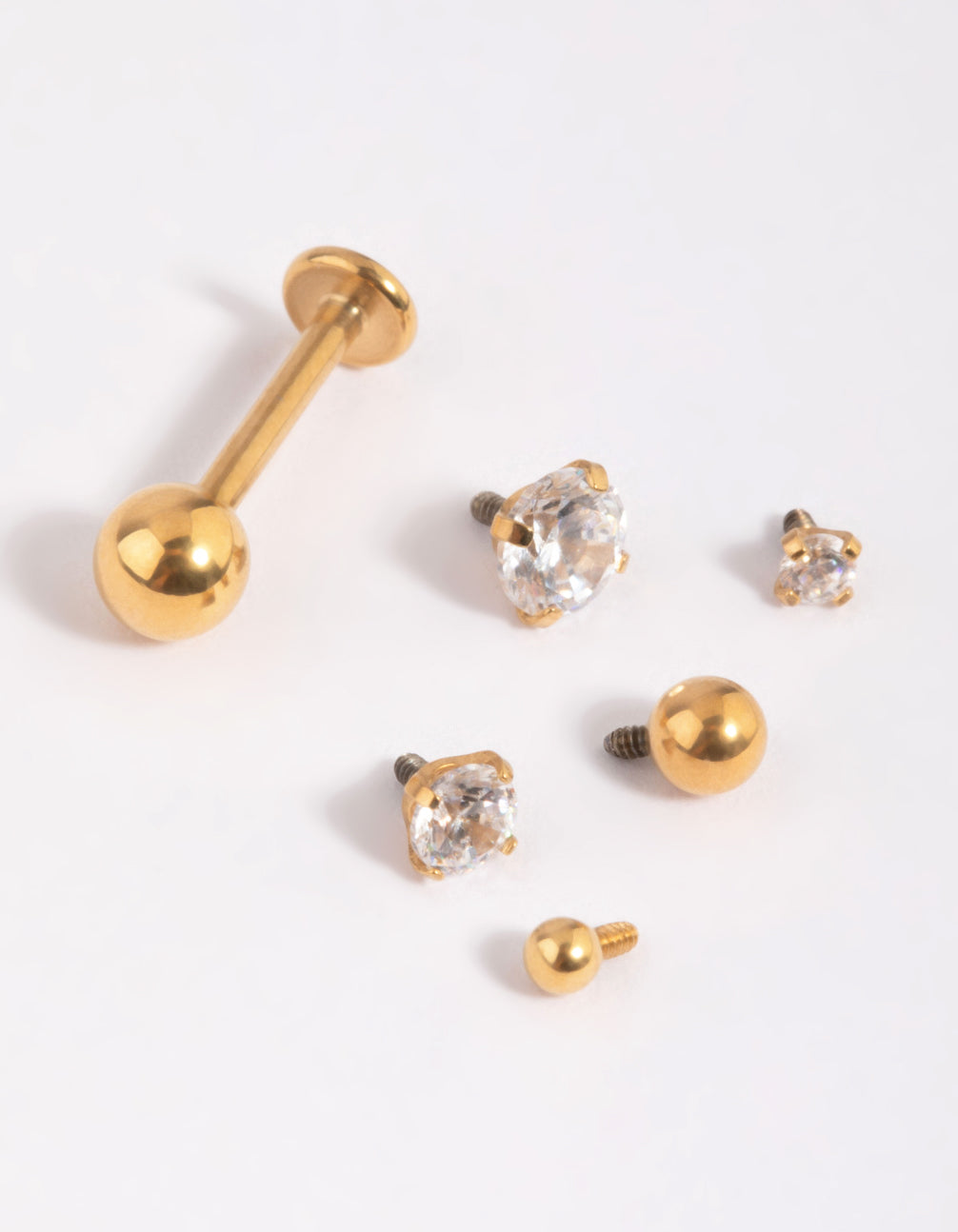 Switch up your style effortlessly with this Gold Plated Surgical Steel Single Flat Back Bar & Cubic Zirconia Interchangeable Ends Pack! This versatile jewellery set features one sleek flat back bar crafted from durable surgical steel with luxe gold plating. The pack comes with six interchangeable screw-on ends, each adorned with shimmering cubic zirconia crystals in a variety of stylish designs, giving you endless options to personalise your look. This set is must-have for anyone looking to mix and match their flat back bar with ease!