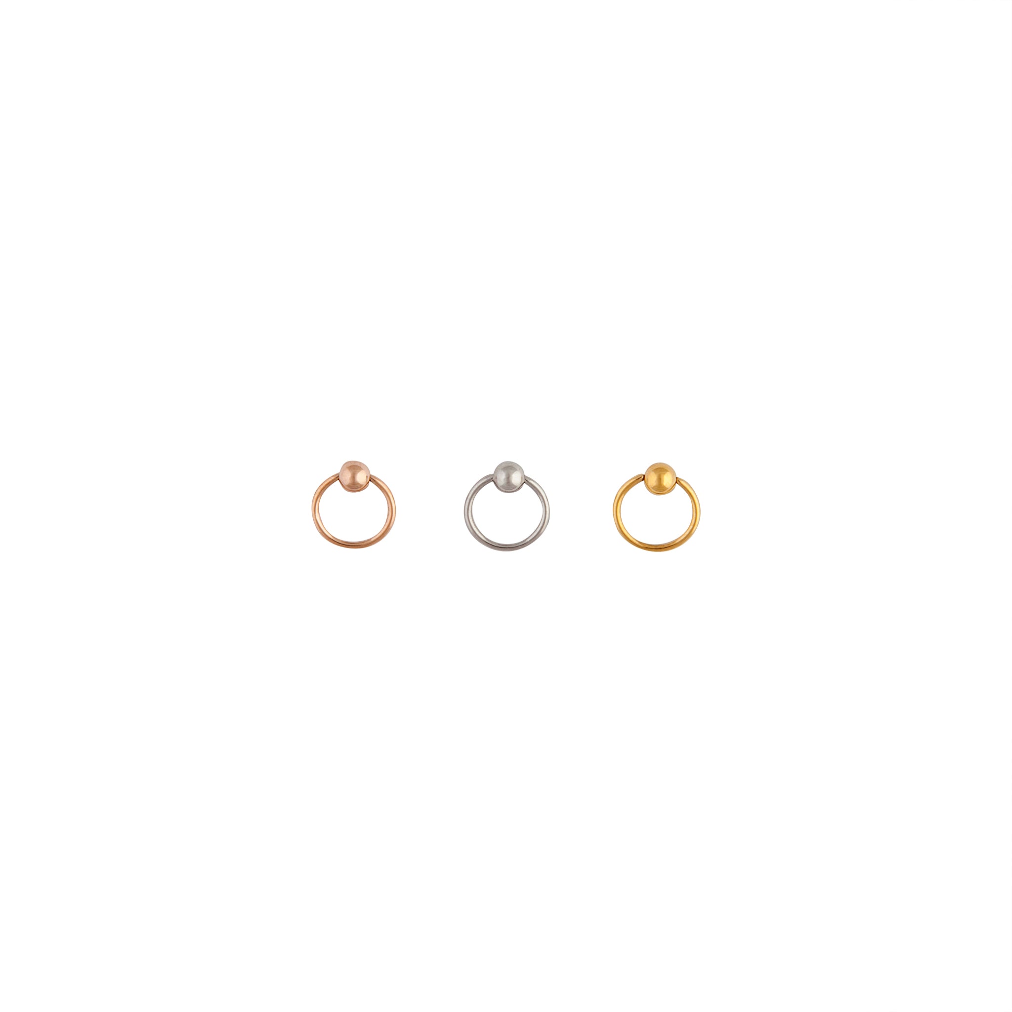 A 3 pack of silver, gold and rose gold tone body jewellery rings in surgical steel.