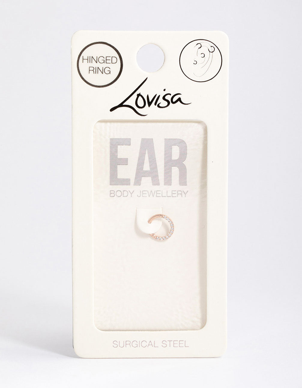 - This versatile clicker ring is plated with real rose gold and embellished with dainty, cubic zirconia crystals for a hint of glamour. Clicker rings can be styled as ear piercings, perfect for your lobe, rook, helix, or even for your septum.