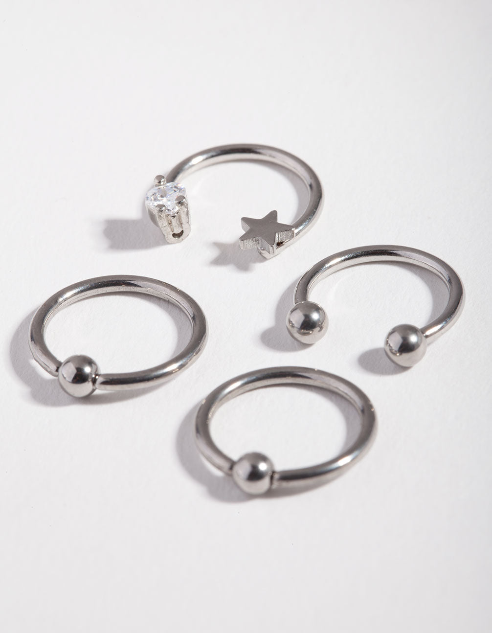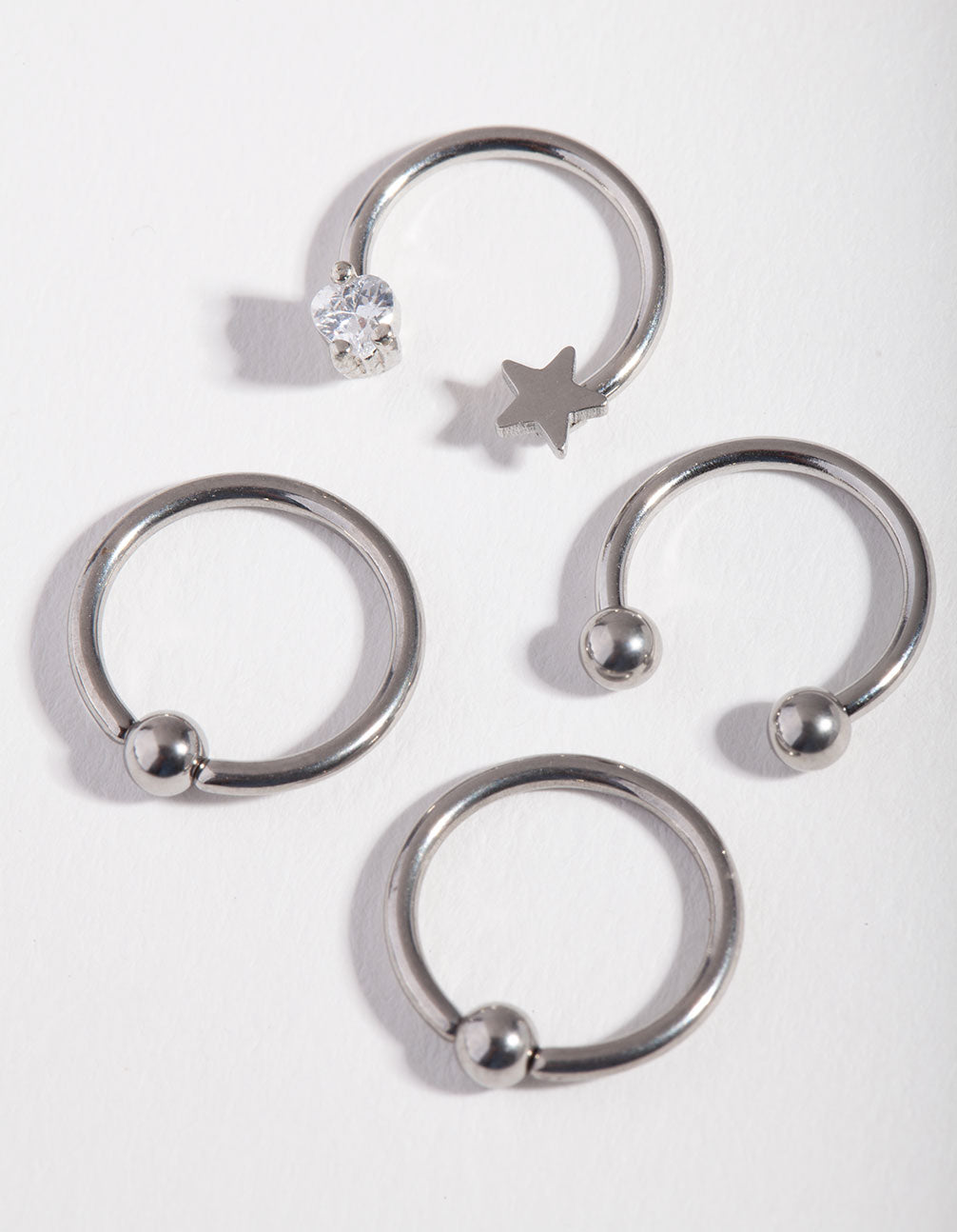 Mix up your look and show off the individual you are with Lovisa body jewellery! This 4-pack of earrings is made from silver-toned surgical steel. Pieces have a gauge of 16, and a length of 1.2mm. Designs include diamantes and stars.
