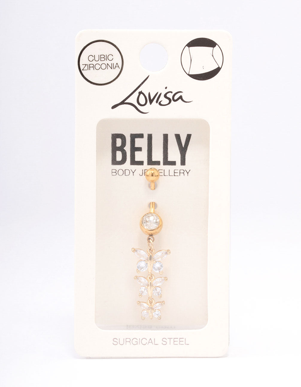 - This belly piercing is plated with real gold and features a graduating, butterfly design — perfect for adding a Y2K-inspired touch to your look.