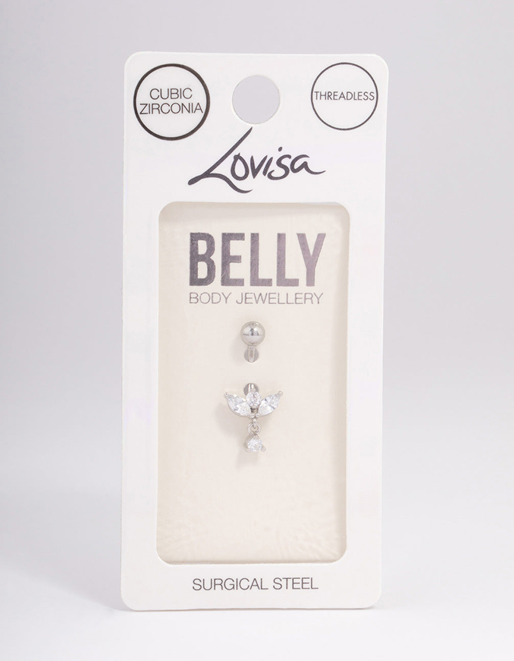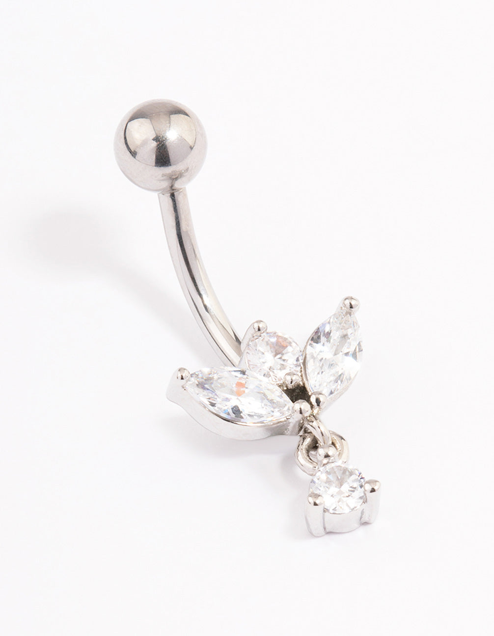 Invest in quality piercing jewellery that's perfect for everyday wear. Crafted from genuine surgical steel, jewellery from our Belly Body Packs Collection is durable, long-lasting and safe for sensitive skin. This belly bar features three cubic zirconia leaves in a marquise style and 1 cubic zirconia drop. This belly bar features a threadless style, for a secure fit and also makes it easier for stud to be removed.