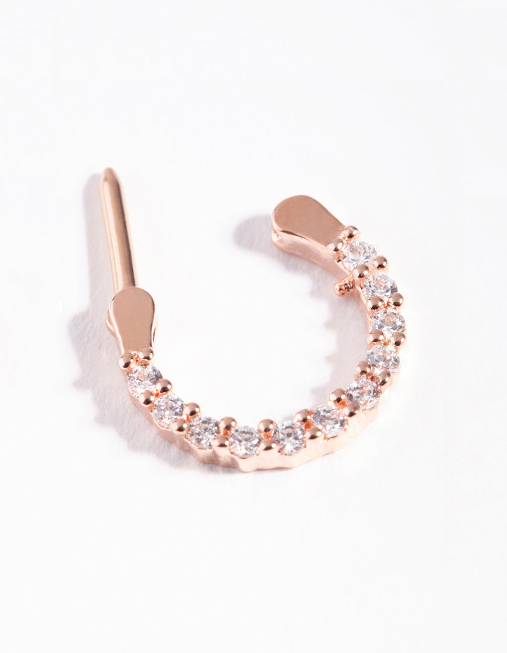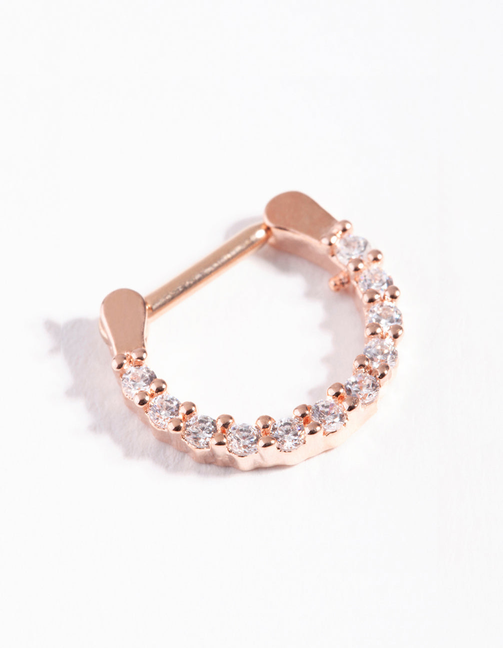 This clicker septum ring is rose-gold toned and adorned with stunning cubic zirconia stones for a luxurious finish. It has a surgical steel post, making it more gentle for daily wear. It has a gauge of 16 and a length of 1.2mm.