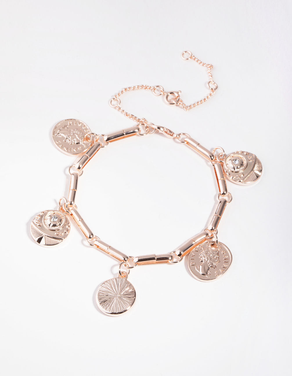 Round out your collection with beautiful fashion-forward bracelets. This piece is plated with genuine rose gold, and boats large coin pendants affixed to a fine chain. Layer with other jewellery for an impactful look.