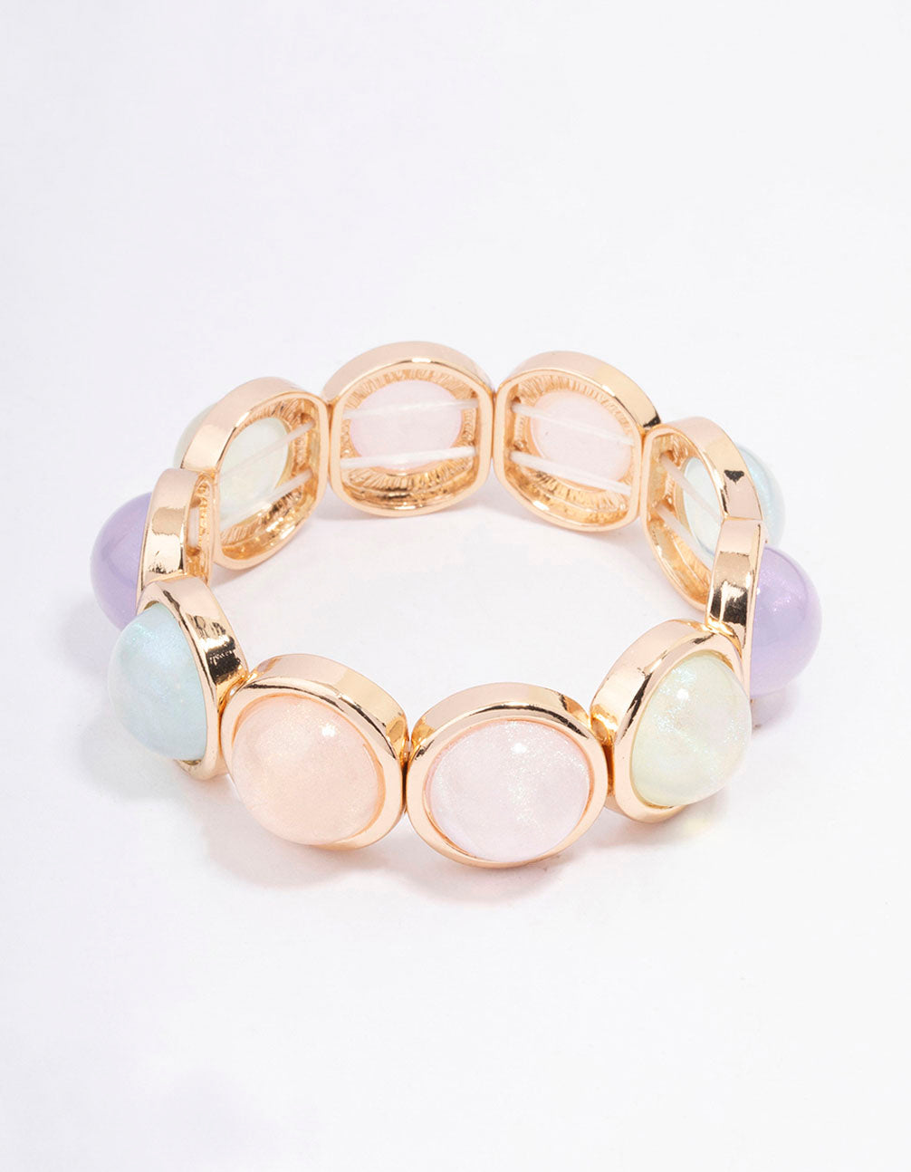 - This gorgeous bangle features a gold-toned finish with an iridescent circle design for added interest.