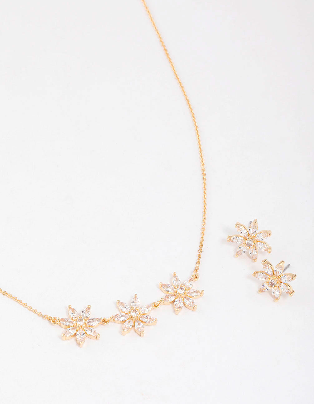 Gold Cubic Zirconia Triple Flower Necklace & Earrings Set