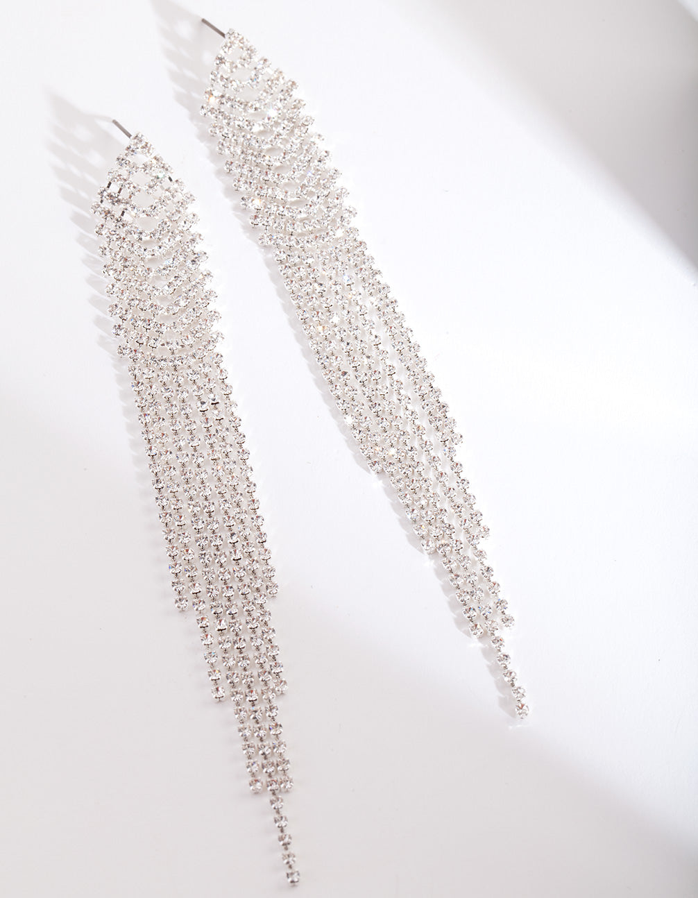 A fun pair of fashion earrings are an easy way to spice up your daily ensembles! These earrings feature a long silver-toned diamante chain design.