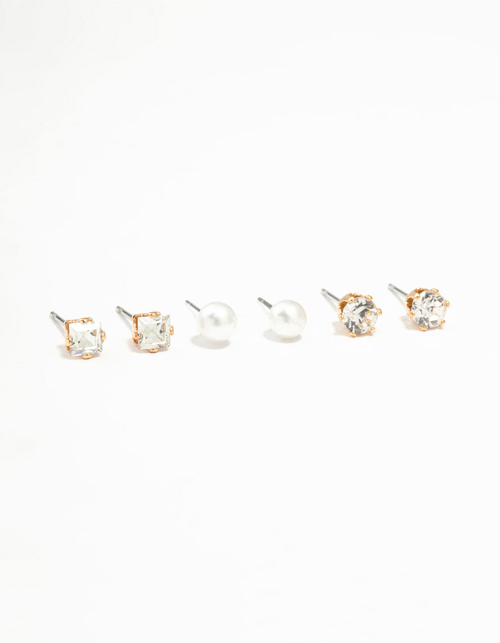 Gold Diamante & Pearl Stud Earrings 3-Pack