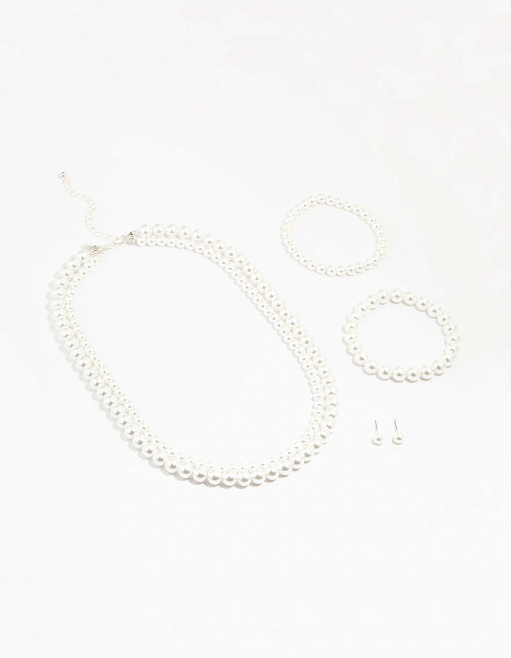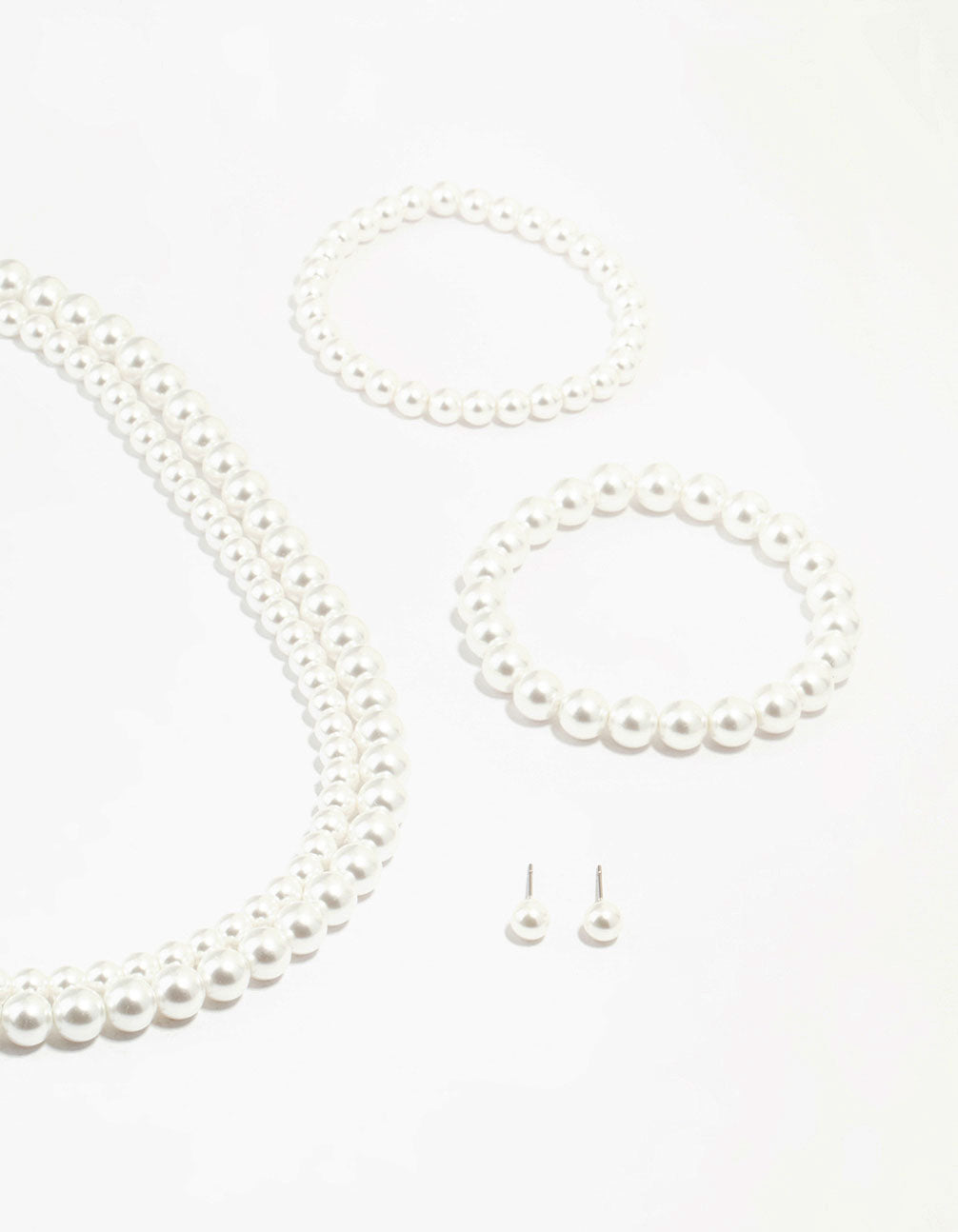 Amp up your style with this double-stranded pearl necklace, earring, and bracelet set. The lustrous pearls add timeless elegance to any outfit, from casual to formal. This classic set is a must-have for a touch of refined sophistication every day.