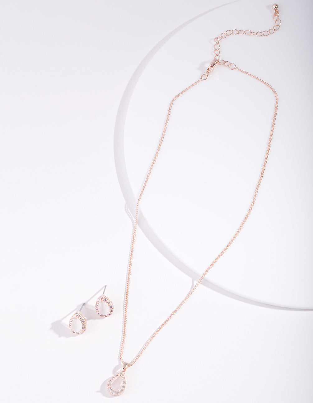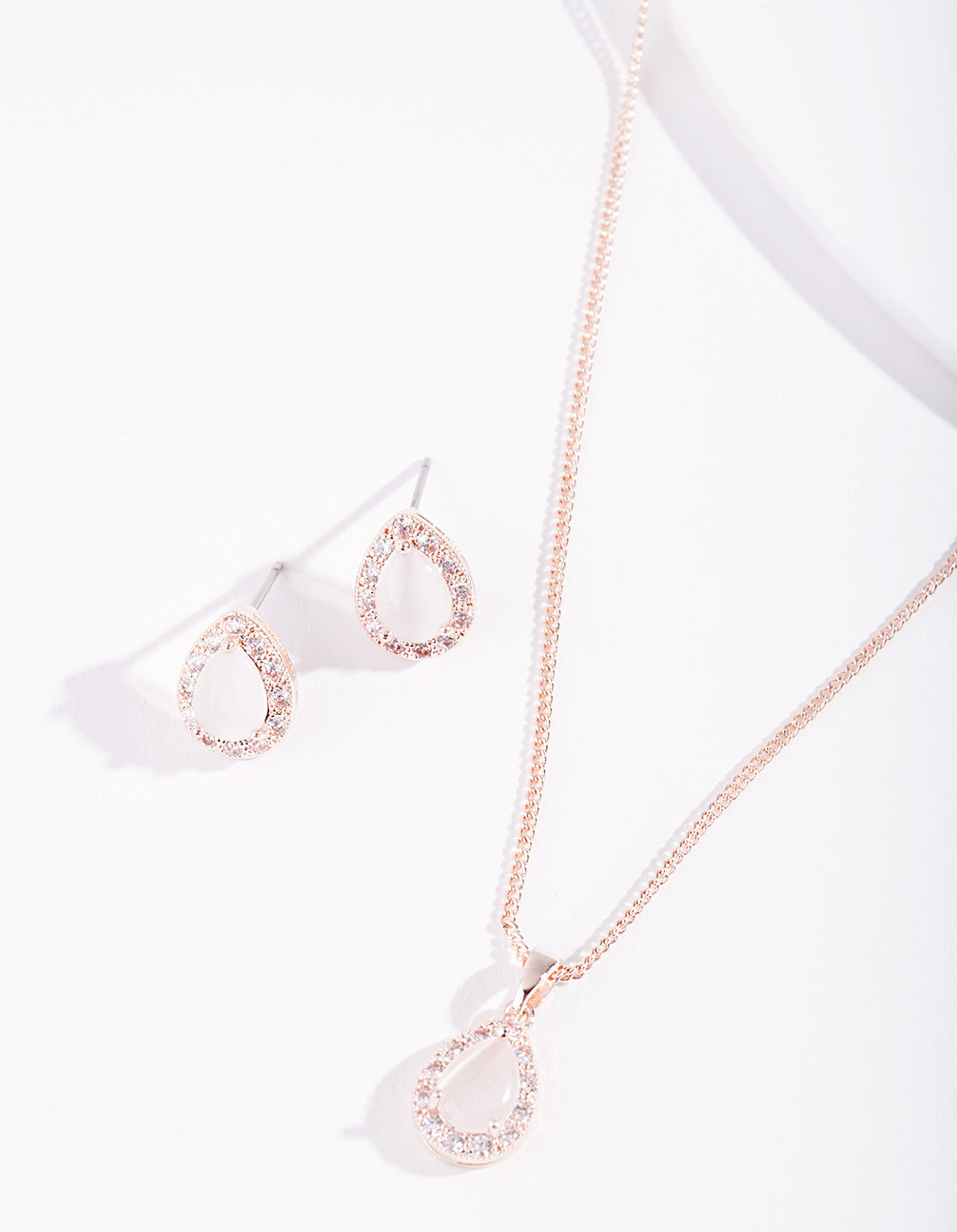 Add some sparkle with Diamond Simulants, cut to emulate the facets and shine of a true diamond. This rose-gold-toned jewellery set features a necklace and earrings in a classic teardrop design.