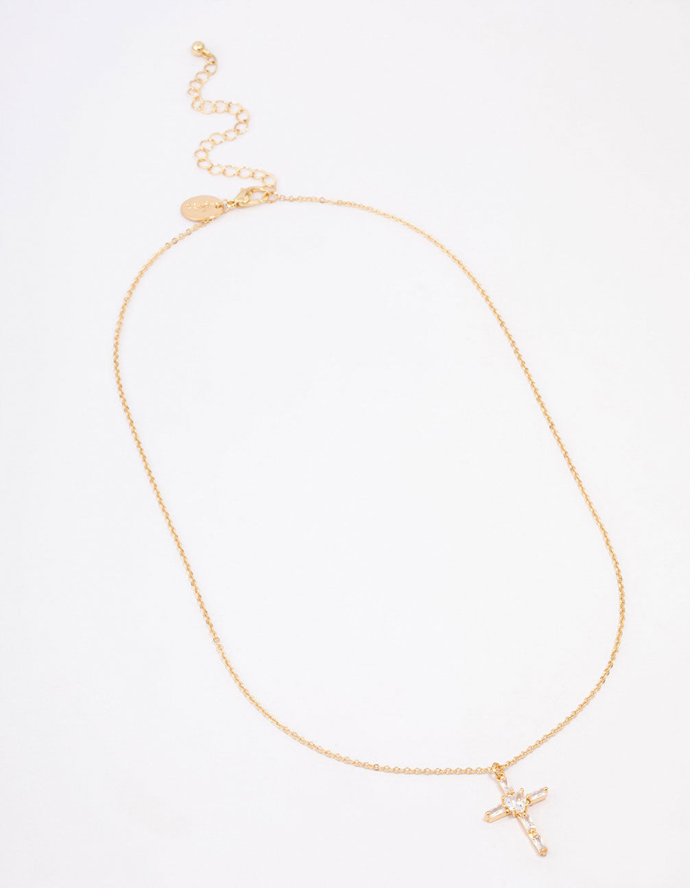 Gold Plated Cubic Zirconia Baguette Cross Short Necklace
