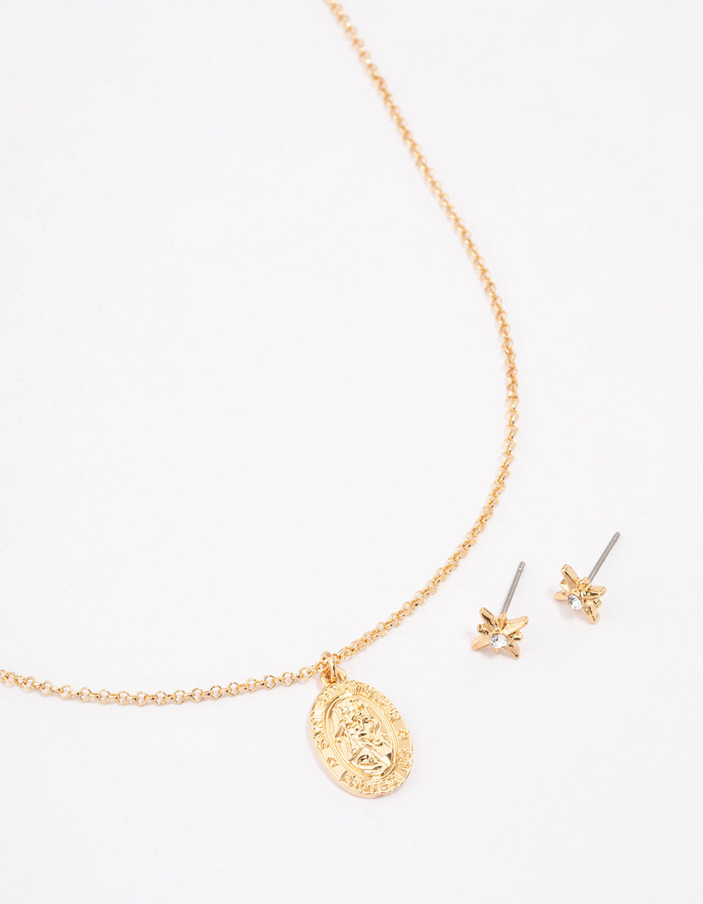 This gold plated jewellery set contains a pair of stud earrings and coin pendant necklace to match.