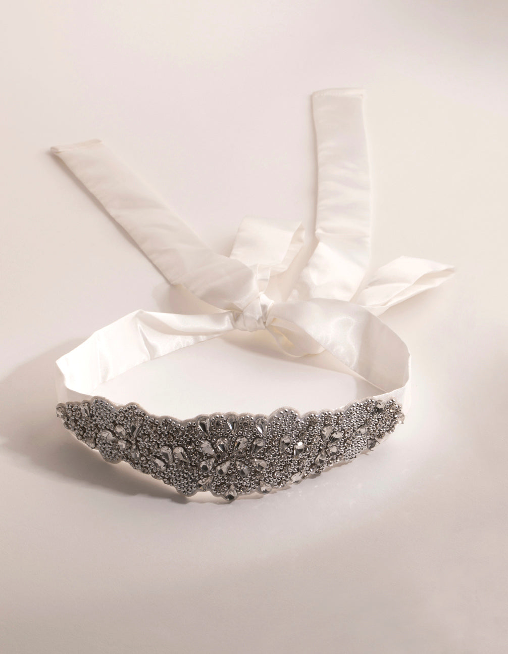 Enhance your outfit! This sash can be worn as a belt with a formal dress, or tied into hair to create a beautiful floral headpiece. The hand-stiched design features ornate beadwork and crystal-like embellishments on a white ribbon.