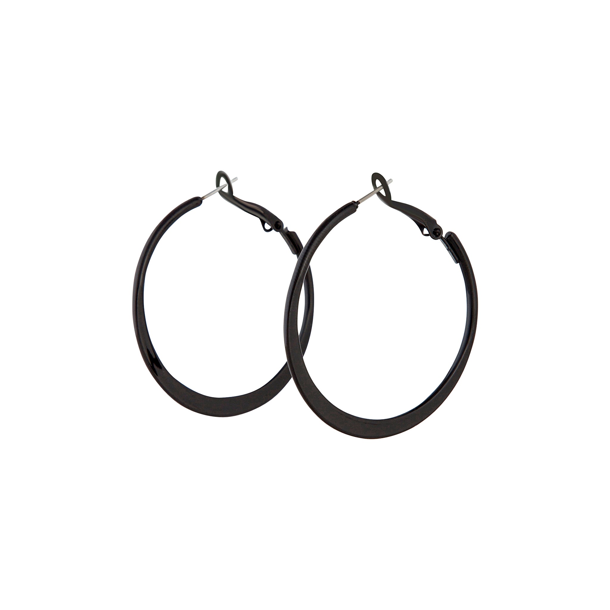 Be bold, be beautiful. This pair of black hoops features an elegant flat bottom design. Classic and fabulous with a little edge, these earrings are a must-have for your collection. Style with other dark toned jewellery for an edgy finish to any outfit.