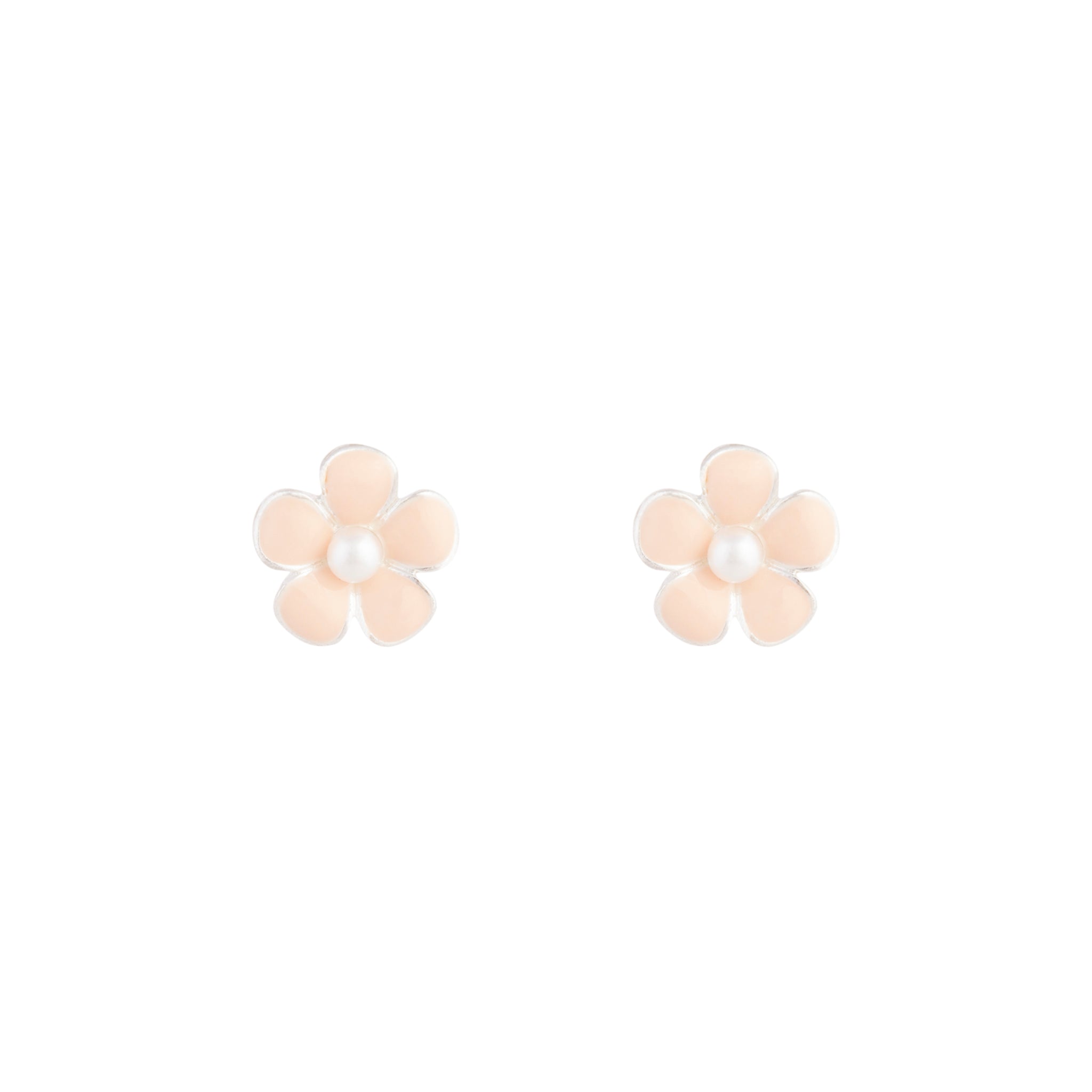 A pair of silver pink daisy stud earrings with a faux pearl in the centre.