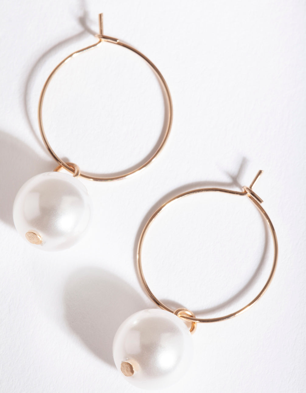 These fun fashion earrings will have you turning heads! This earring boasts a hoop large pearl charm design in a gold-tone setting