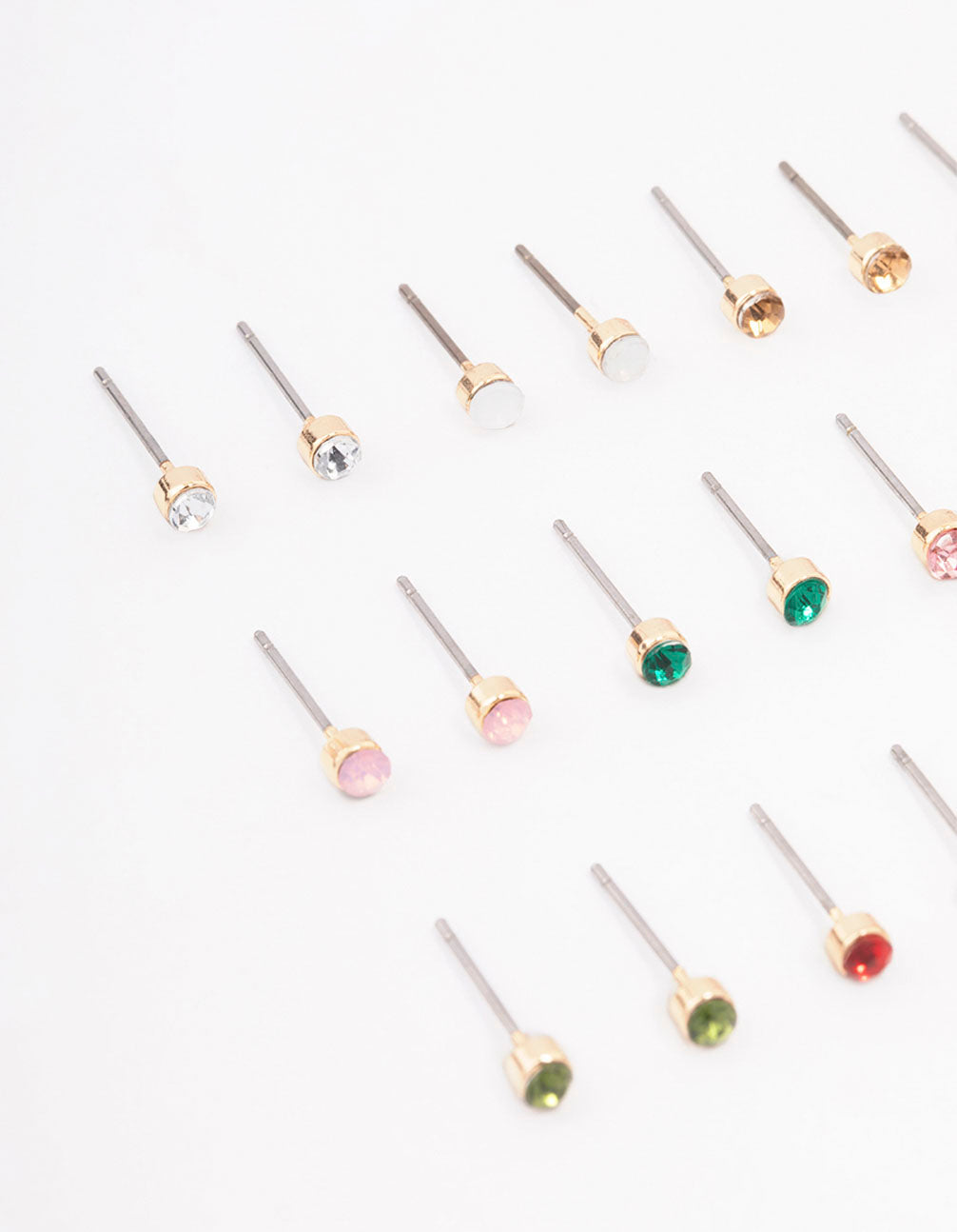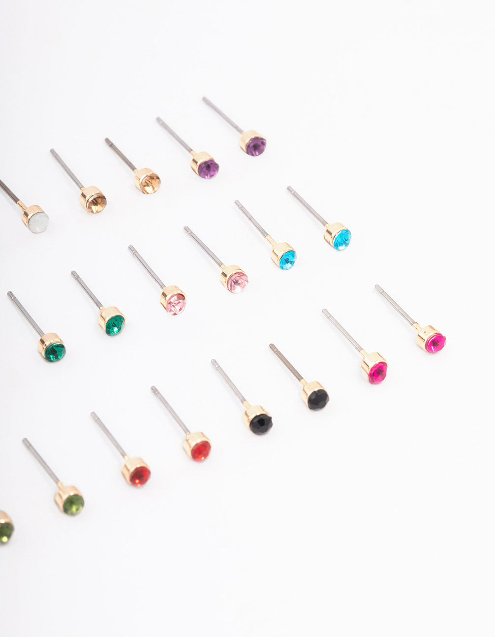 - This earring pack contains 12 pairs of gold hoop and stud earrings adorned with a collection of diamantes for a glamorous feel.