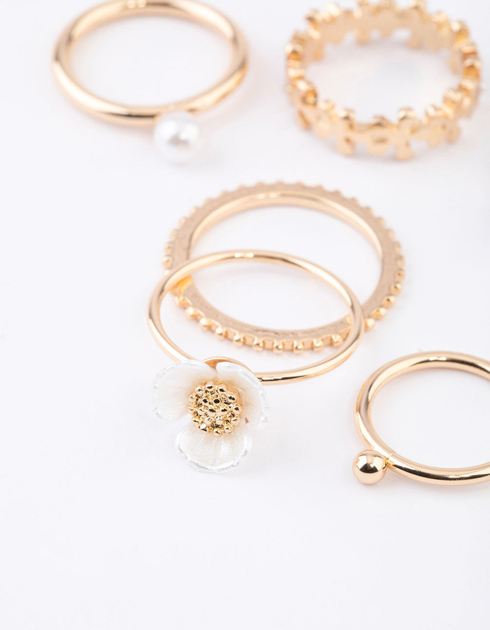 - This ring pack contains six, gold-toned rings designed with flower motifs for a botanical-inspired finish.