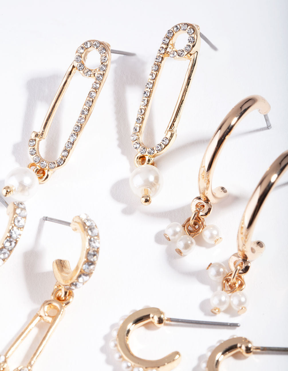 This style is perfect for those who have multiple piercings and want to achieve a fashion-forward look! This gold-toned earring 6 pack features diamante & pearl hoop and safety pin styles that give an edgy and modern look. Whether your creating an ear stack or just like to mix and match, this style is a bold & glamorous feature to your outfit!