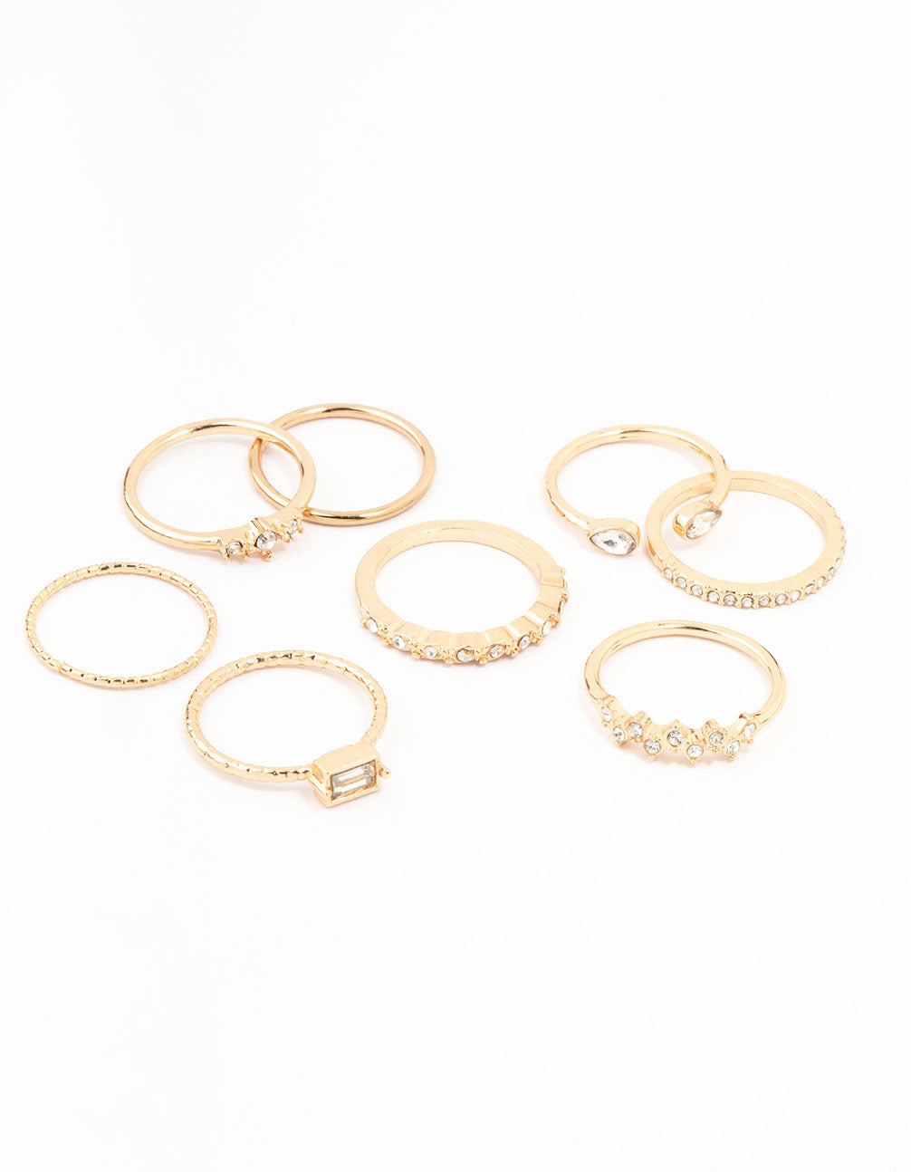Elevate your look with this stunning 8-piece set of stackable rings in gleaming gold-tone with dazzling diamante embellishments. Mix and match these chic stunners, there's a combo for every mood.
