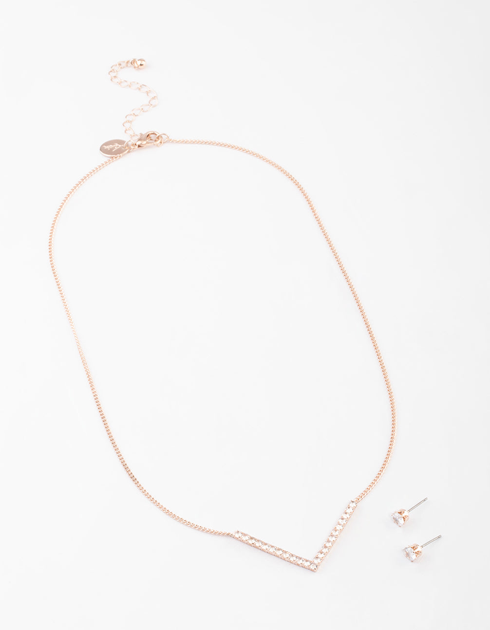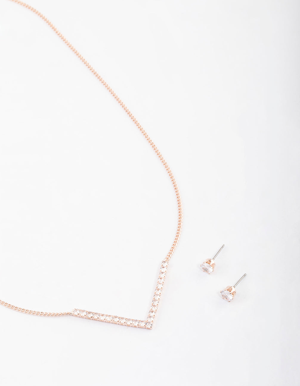 Rose Gold Cubic Zirconia V Necklace & Stud Earrings Set