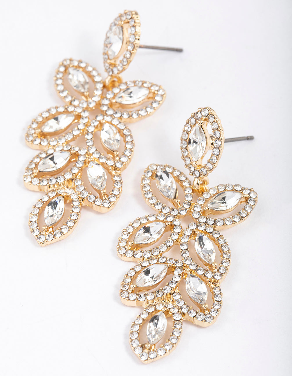 - Style these Gold Flower Cut Out Diamante Drop Earrings with a gold diamante cup chain necklace for a cohesive, stylish finish to your look.