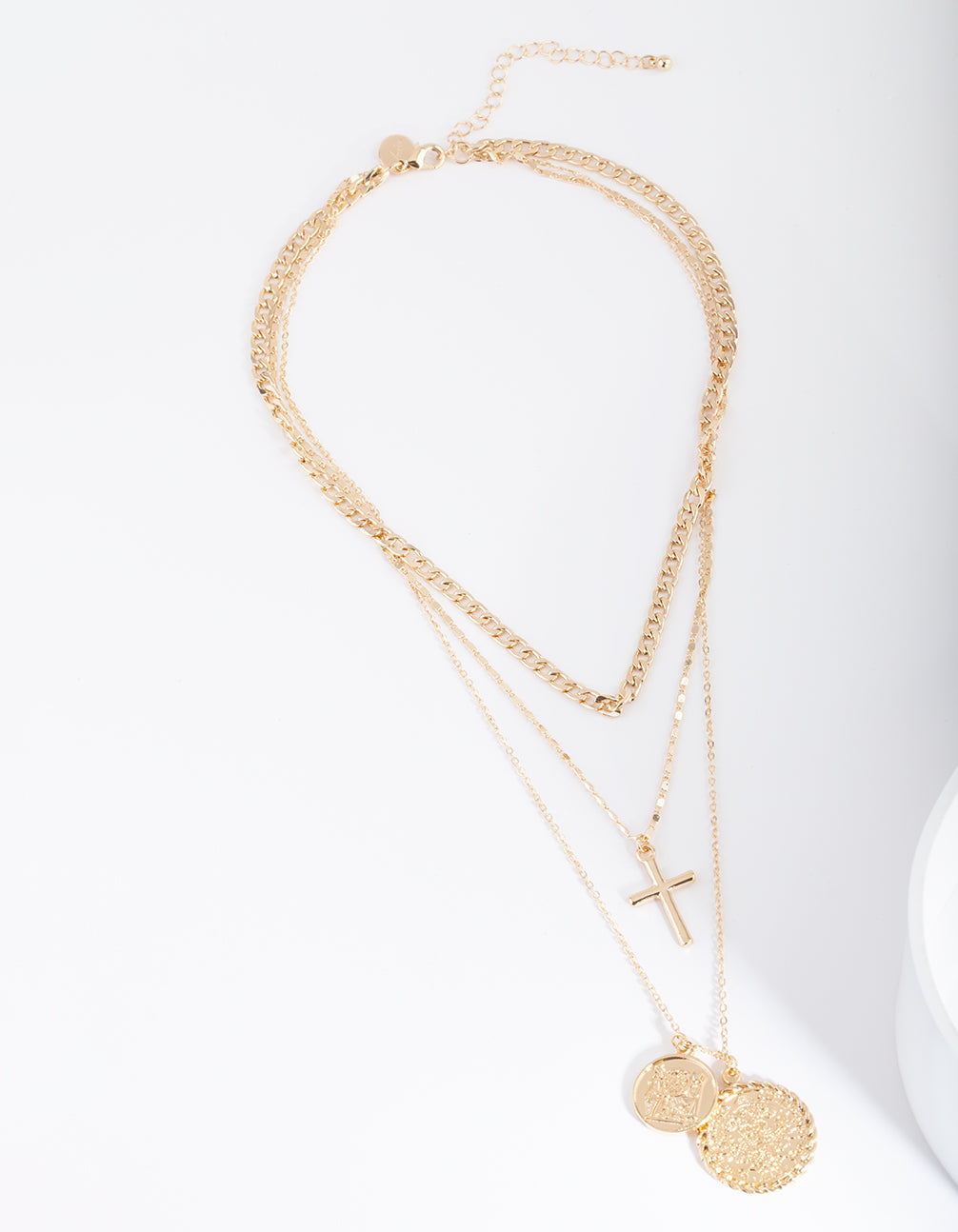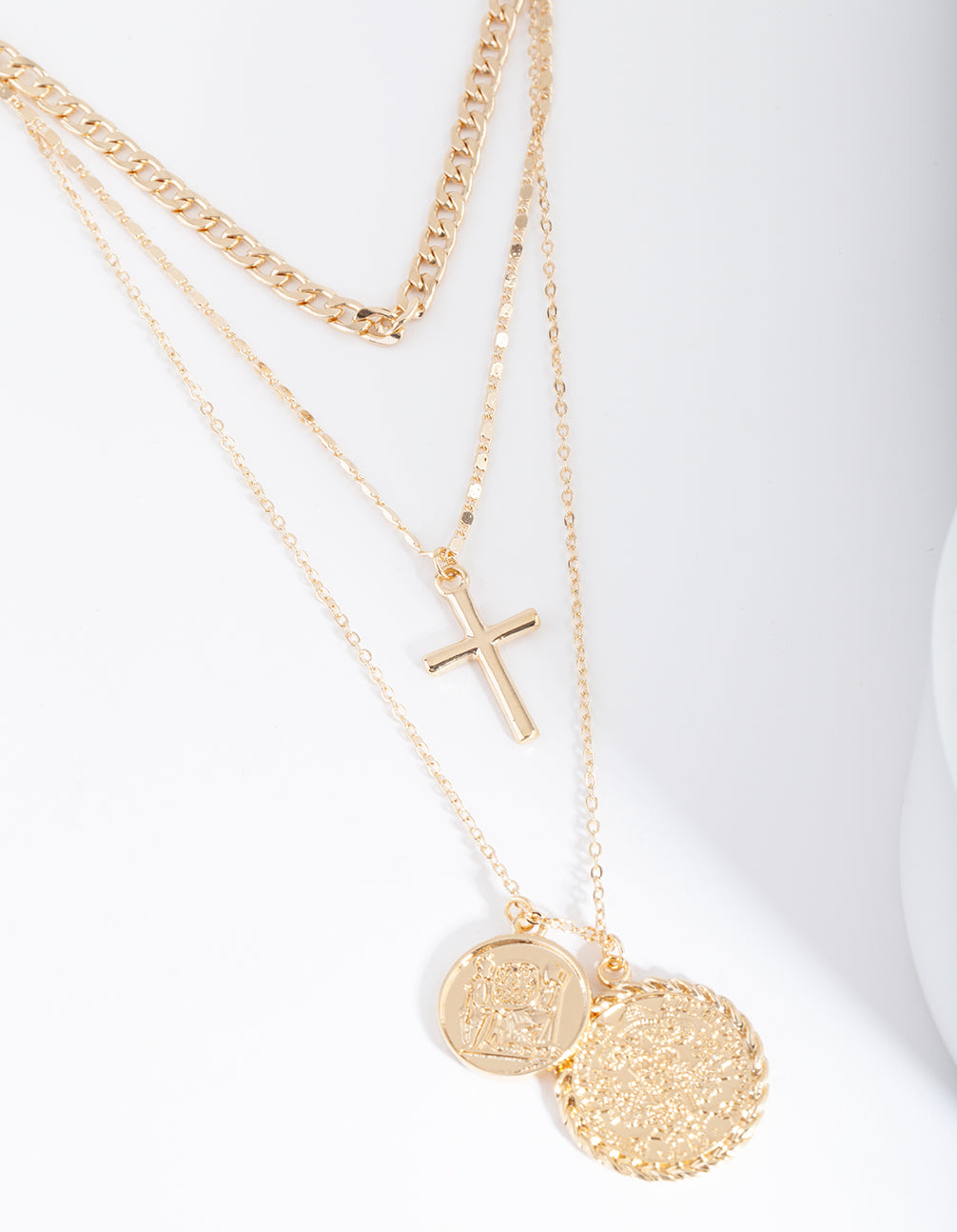 Layer it up with finer chains or wear alone for a considered look. Nearly every outfit can be elevated with neckwear. This necklace boasts a layered design with a coin and cross motif.