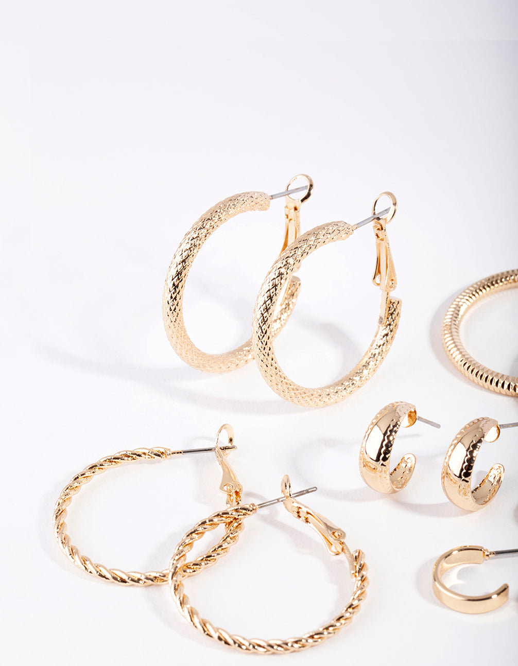 An earring pack makes the perfect jewellery box addition. This style comes with 6 textured gold-toned hoop earrings so you can mix and match to suit your look. Make a statement by stacking them up or keep it refined with a single pair.